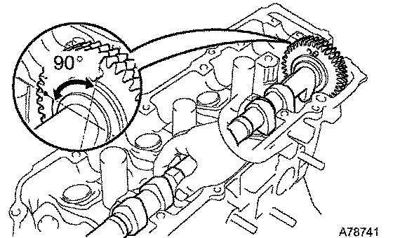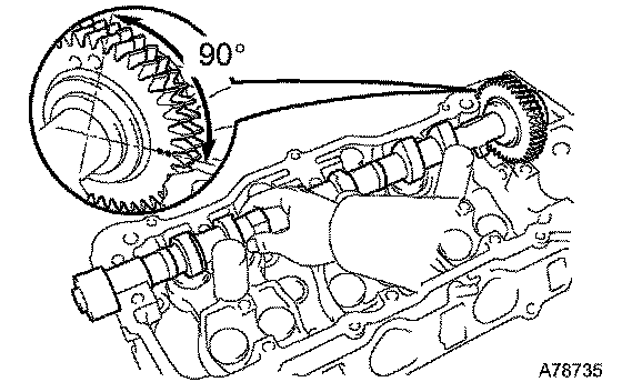 b. Place the No. 2 camshaft at a 90° angle of the timing mark (2 dot marks) on the cylinder head.