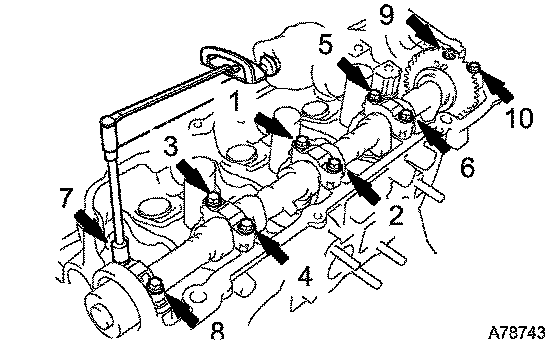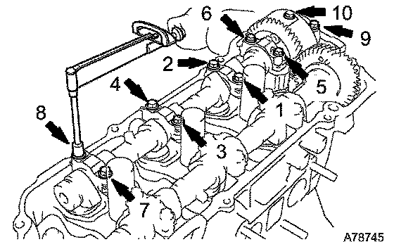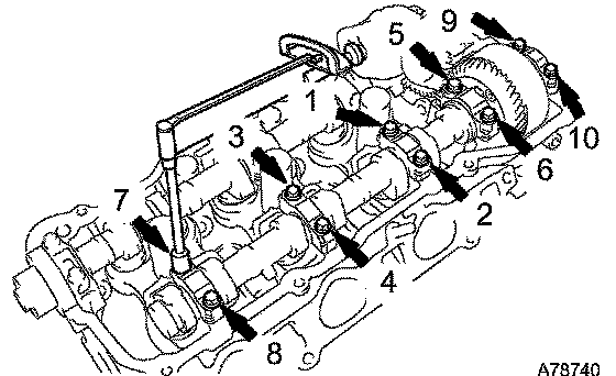f. Uniformly tighten the 10 bearing cap bolts uniformly in the sequence shown in the illustration.