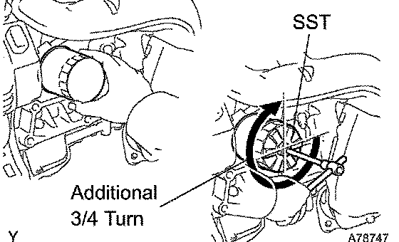 f. Using SST, turn the crankshaft pulley, and align the timing marks of the timing pulley with the No. 3 timing belt cover.
