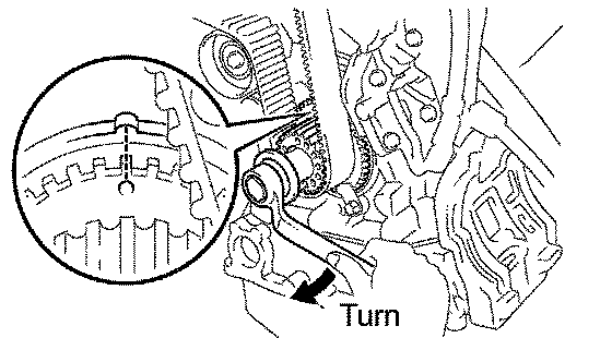 g. Turn the crankshaft, and align the timing mark of the crankshaft timing pulley with the oil pump body.