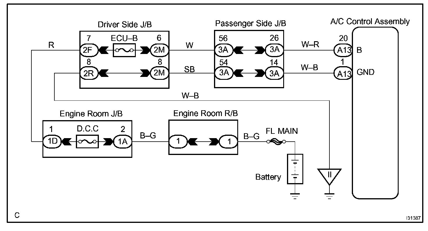 This is the back-up power source for the air conditioner amplifier. Power is supplied even when the ignition switch is off and is used for diagnostic trouble code memory, etc.