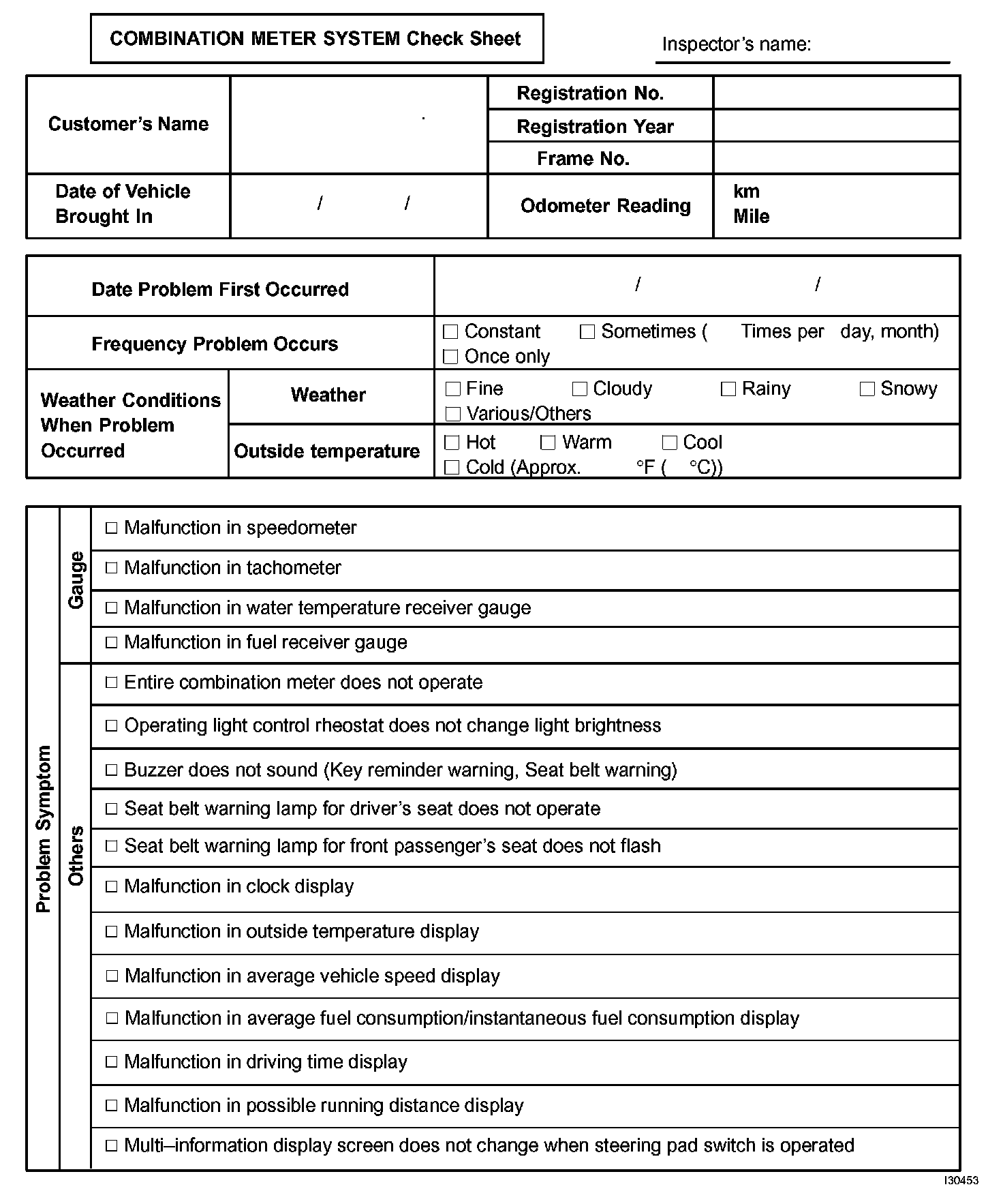 Combination Meter System Check Sheet:
