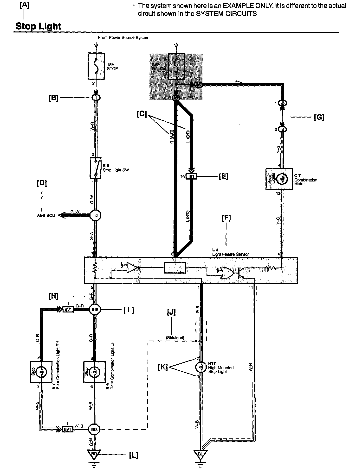 When the ignition SW is turned on and the brake pedal is pressed (Stop light SW on), if the stop light circuit is open, the current flowing from TERMINAL 7 of the light failure sensor to TERMINALS 1, 2 changes, so the light failure sensor detects the disconnection and the warning circuit of the light failure sensor is activated.