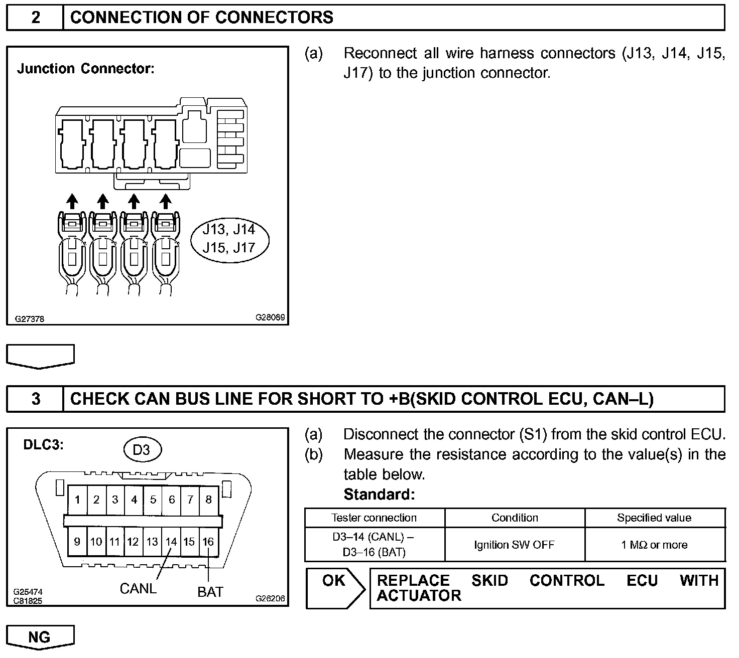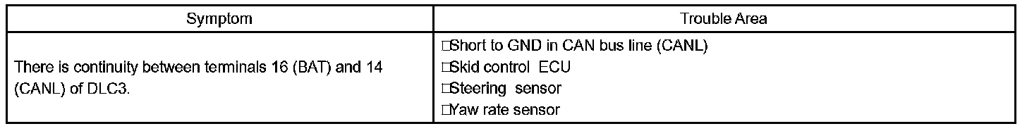 A short to the +B is suspected in the CAN bus line when there is continuity between terminals 16 (BAT) and 14 (CANL) of the DLC3.