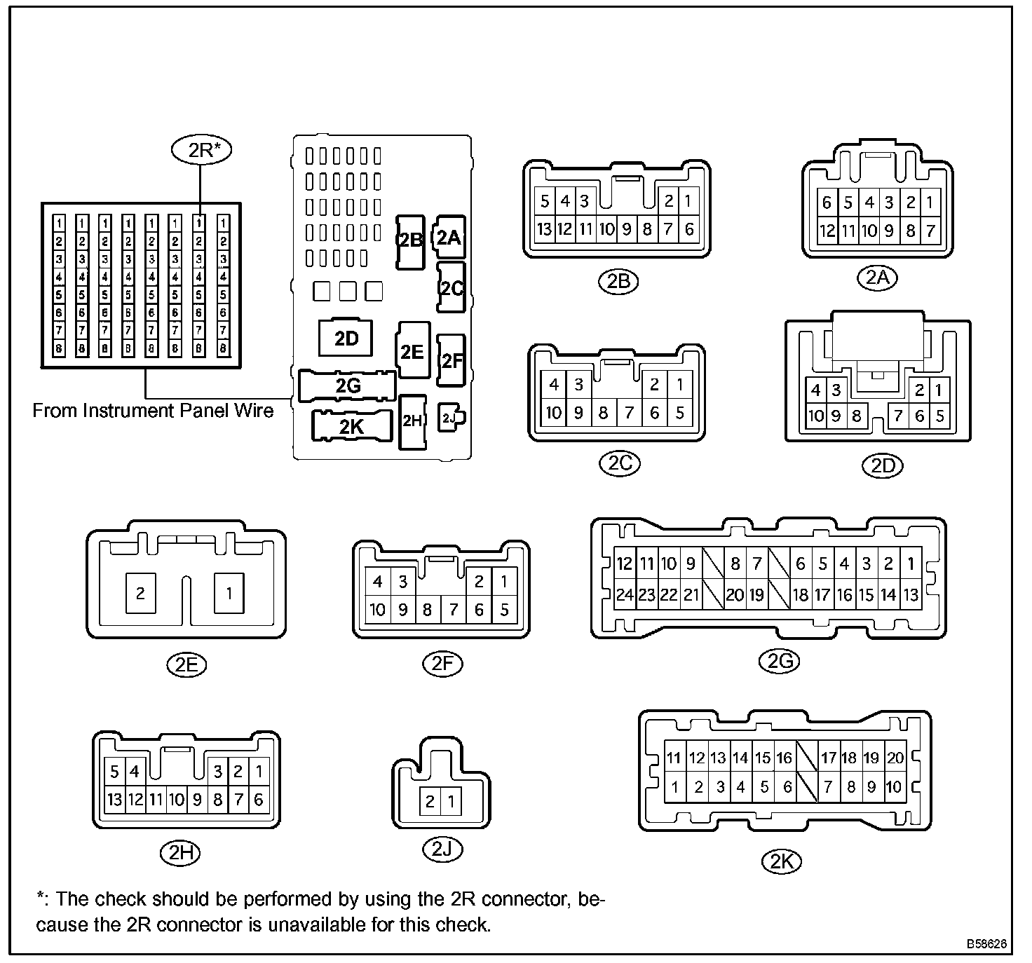 a. Disconnect the 2B, 2F and 2G instrument panel J/B connectors, and check the continuity and voltage of each terminal of the disconnected connectors.