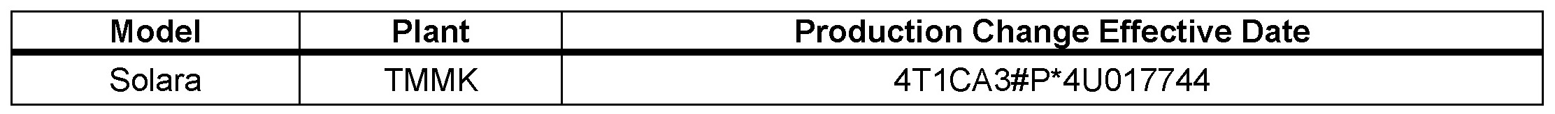 - 2004 model year Camry (1MZ-FE/3MZ-FE), Solara and Sienna (3MZ-FE) vehicles produced BEFORE the Production Change Effective VINs shown below.