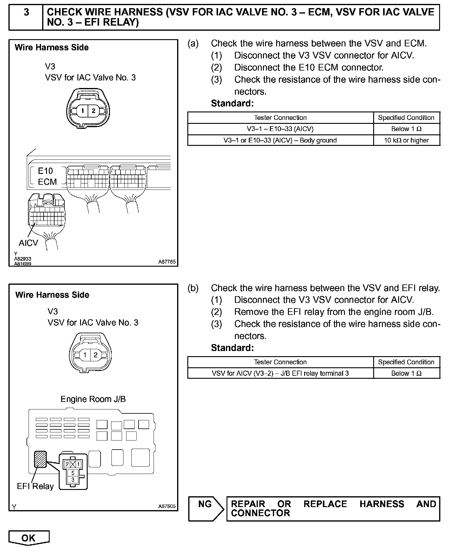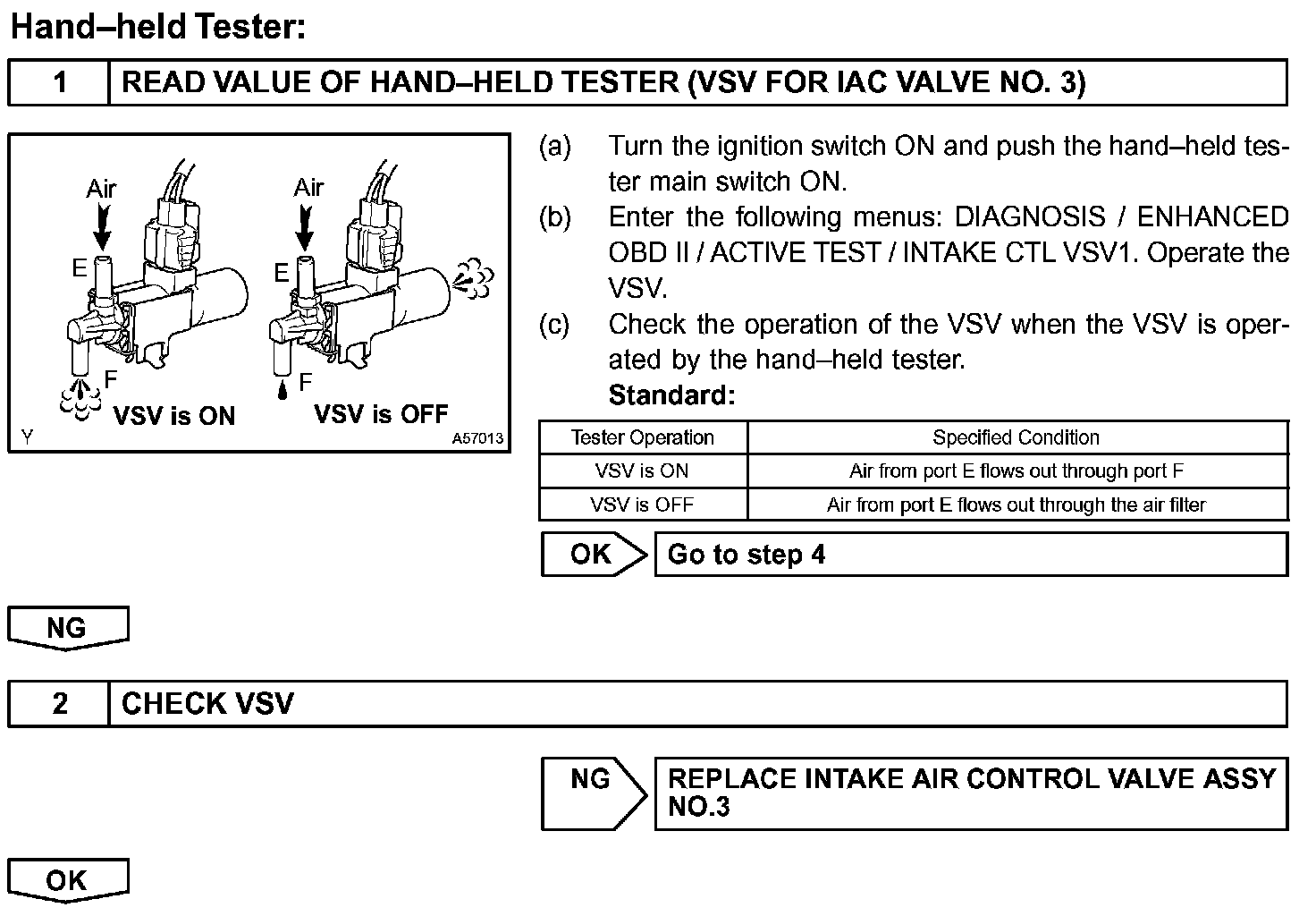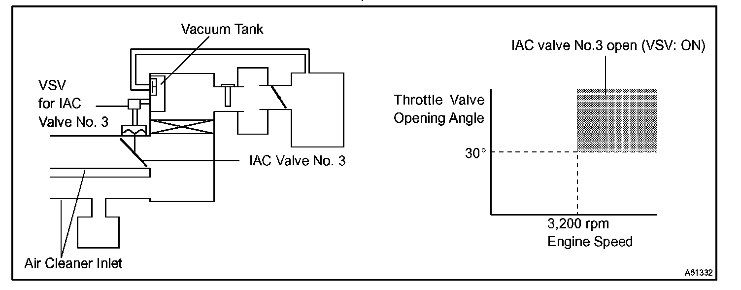 When the engine is operating at low to mid speeds, this system operates the IAC valve to close one of the air cleaner inlets. When the engine speed is more than 3,200 rpm and the opening angle of the throttle valve is more than 30°, the ECM activates the VSV and opens the IAC valve No. 3.