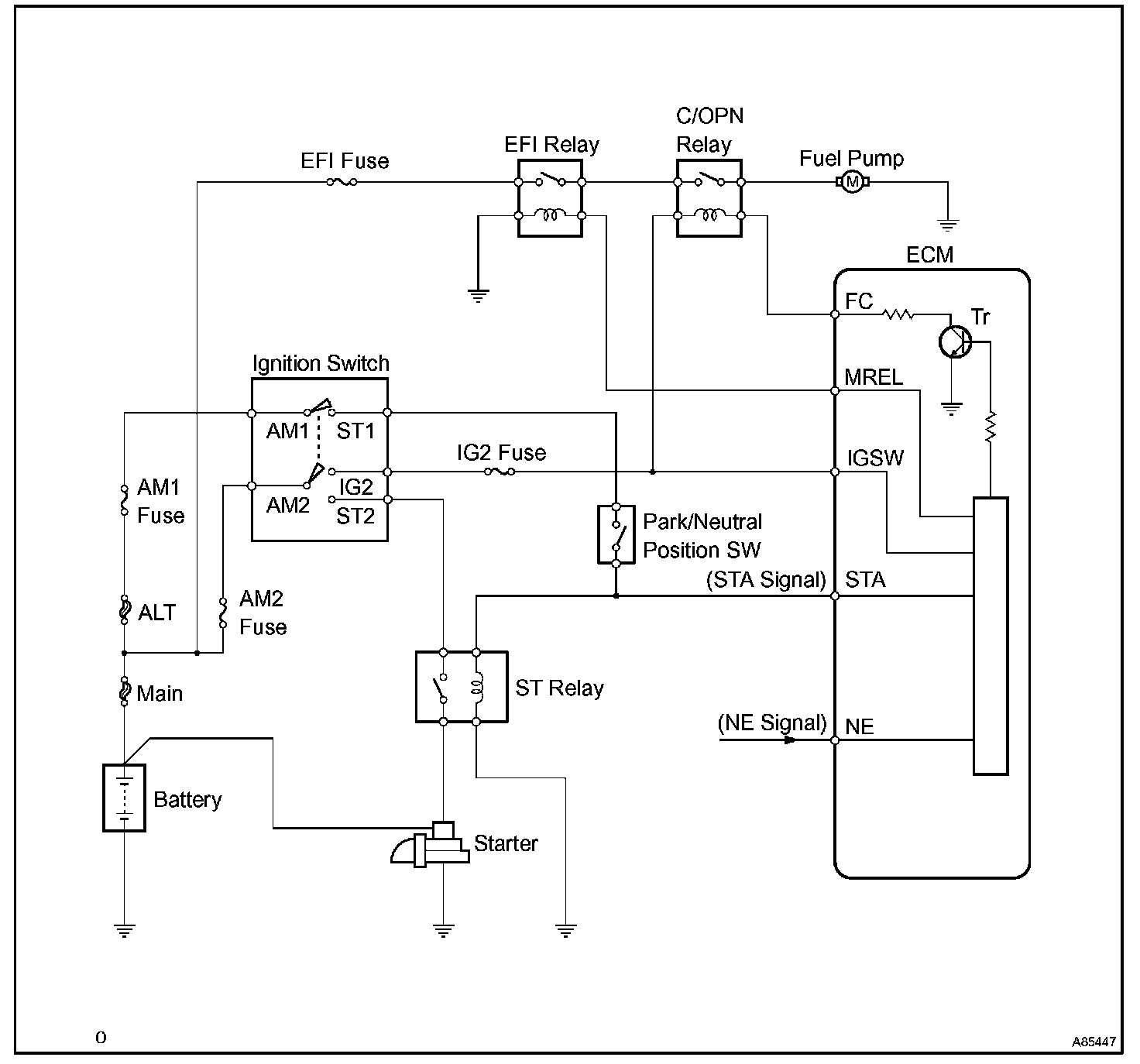 When the STA signal and NE signal are input to the ECM, Tr is turned ON, current flows to coil of the circuit opening relay (Marked: C/OPN), the relay switches on, power is supplied to the fuel pump and the fuel pump operates.