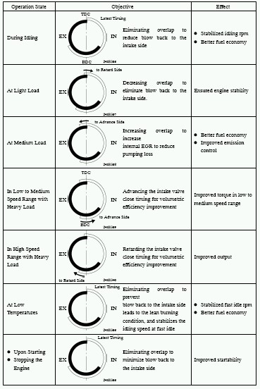 The VVT-i system is designed to control the intake camshaft within a range of 60° (of crankshaft angle) to provide valve timing that is optimally suited to the engine condition. This improves torque in all the speed ranges as well as increasing fuel economy and reducing exhaust emissions.