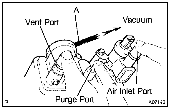 1. While holding the vent and air inlet ports closed, apply vacuum (3.43 kPa, 25.7 gf/sq.cm, 1.01 psi) to the purge port, and check that the vacuum is maintained for 1 minute.