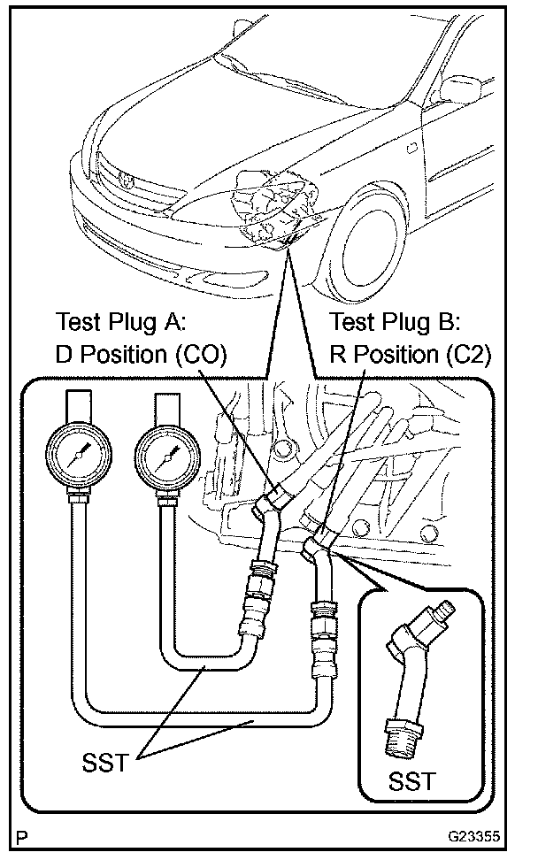14. Remove the test plug B, install the SST and start engine.