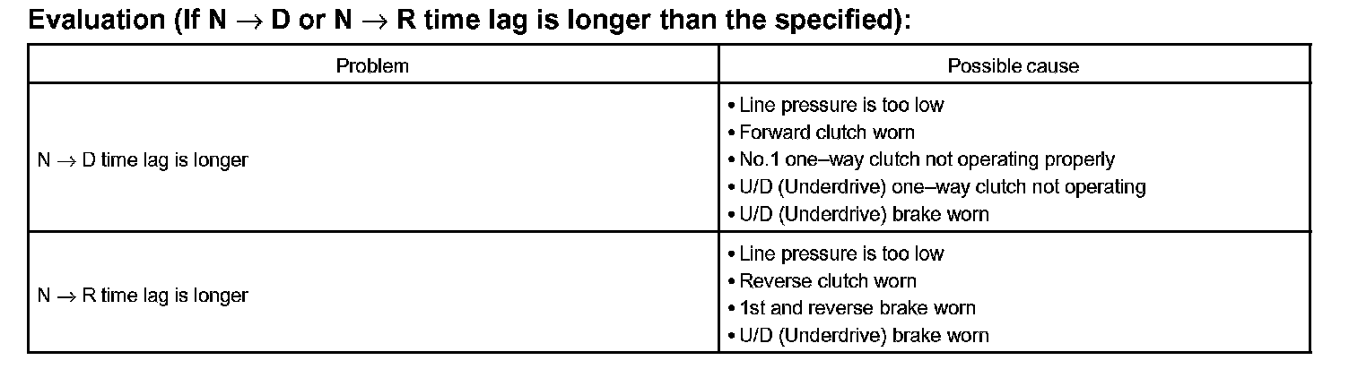 1. When the shift lever is shifted while the engine is idling, there will be a certain time lapse or lag before the shock can be felt. This is used for checking the condition of the direct clutch, forward clutch, and 1st and reverse brake.