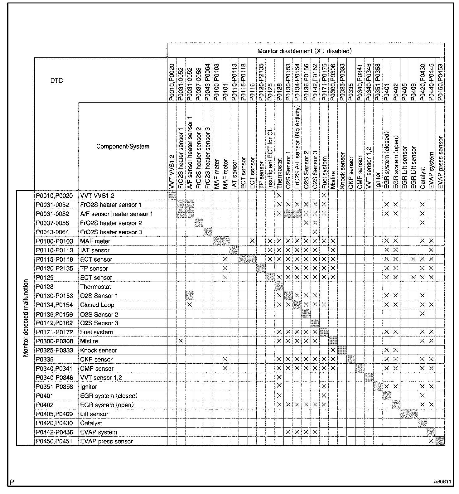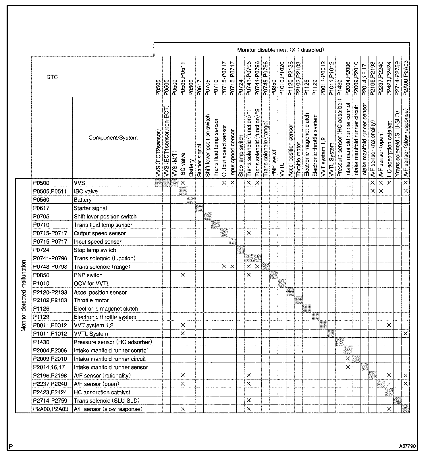 LIST OF DISABLE A MONITORHINT: This table indicates ECM monitoring status for the items in the upper columns if the DTCs in each line on the left are being set. As for the "X" mark, when the DTC on the left is stored, detection of the DTC in the upper column is not performed.