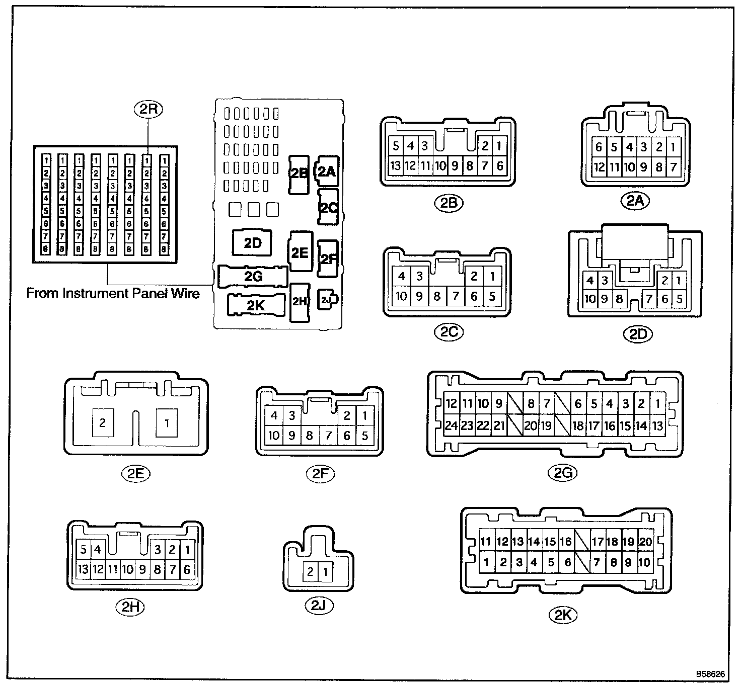 a. Disconnect the 2B, 2F and 2K instrument panel J/B connectors, and check the continuity and voltage of each terminal of the disconnected connectors.