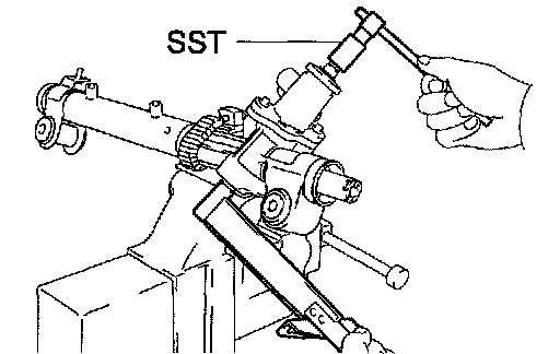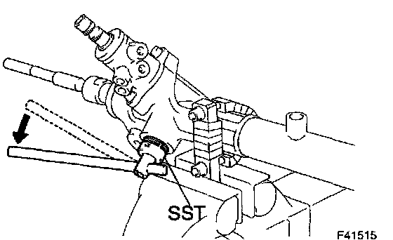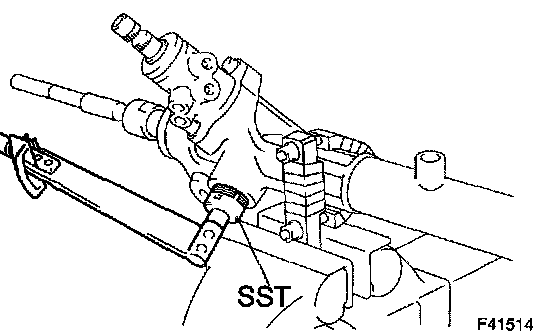 ^ Using SST, hold the power steering rack and install the steering rack end sub-assy.
