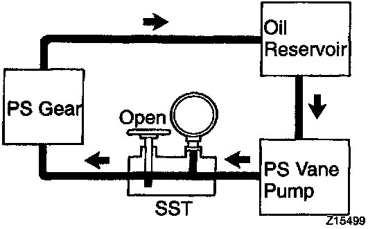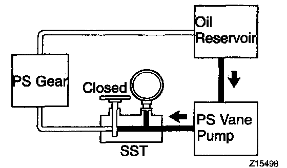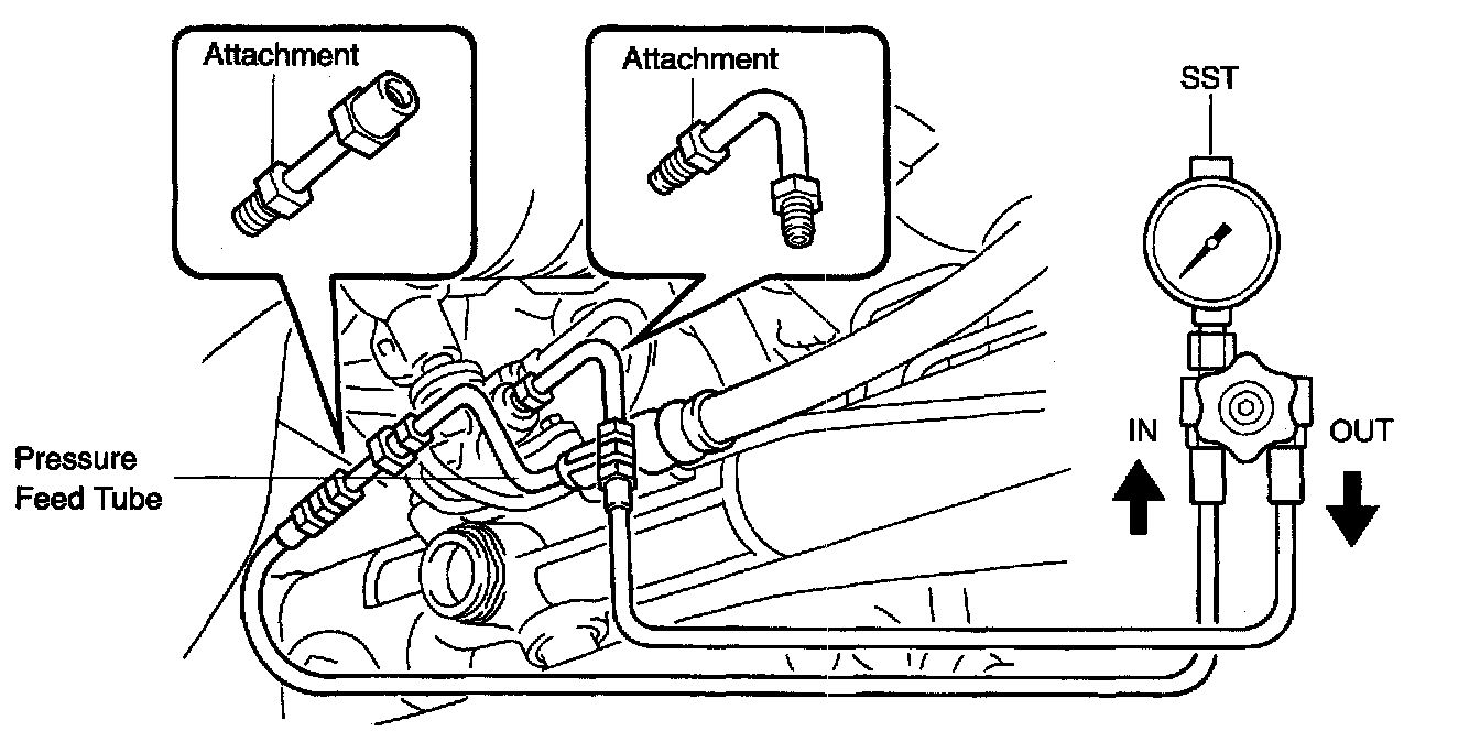 f. With the engine idling, close the valve of the SST and observe the reading on the SST.