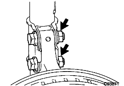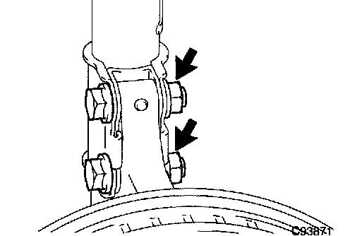 c. Install the 2 bolts and 2 nuts to the lower side of front shock absorber with coil spring.