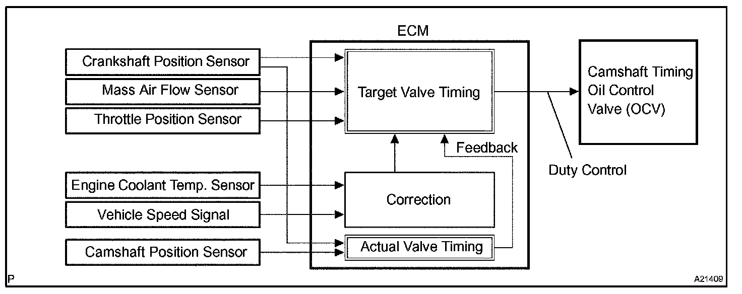 The Variable Valve Timing (VVT) system includes the ECM, the Oil Control Valve (OCV) and the VVT controller. The ECM sends a target "duty-cycle" control signal to the OCV. This control signal, applied to the OCV,regulates the oil pressure supplied to the VVT controller. Camshaft timing control is performed based on engine operation conditions such as the intake air volume, throttle position and engine coolant temperature. The ECM controls the OCV, based on the signals output from the sensors. The VVT controller regulates the intake camshaft angle using oil pressure through the OCV. As a result, the relative position between the camshaft and the crankshaft is optimized, and the engine torque improves, fuel economy improves, and exhaust emissions decrease under overall driving conditions. Also, the ECM detects the actual valve timing using signals from the camshaft position sensor and the crankshaft position sensor, and performs the feedback control. This is how target valve timing is verified by the ECM.