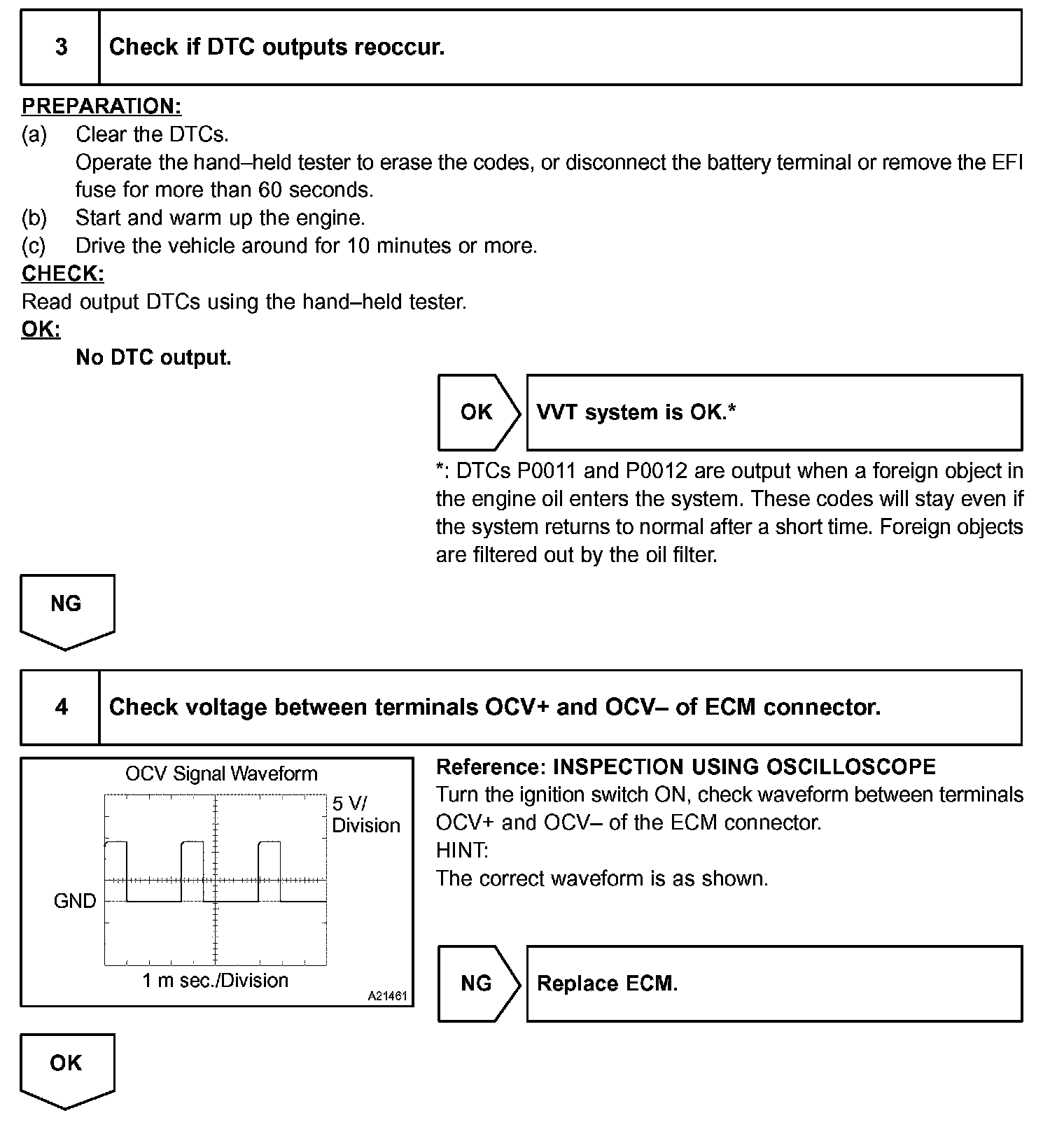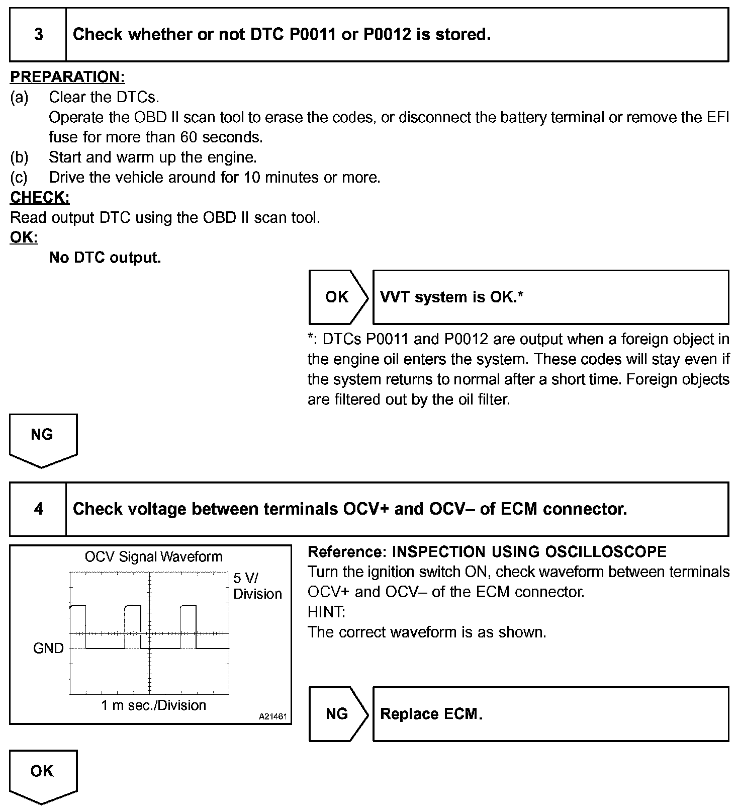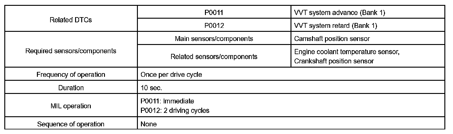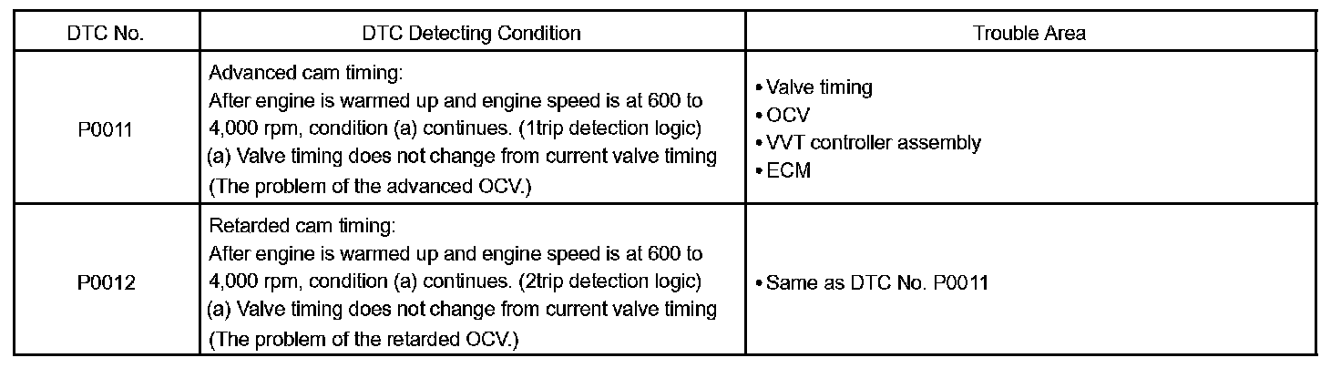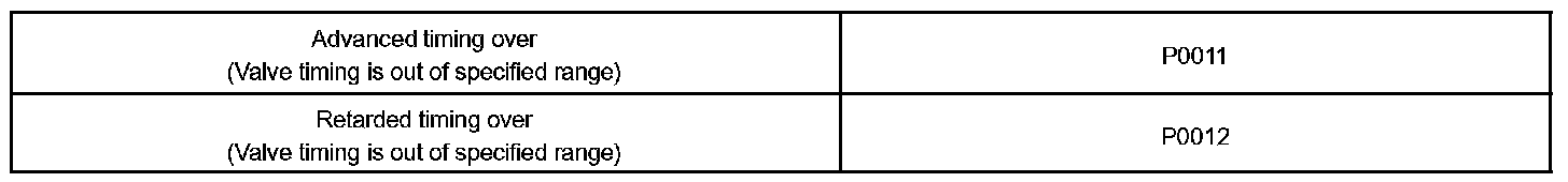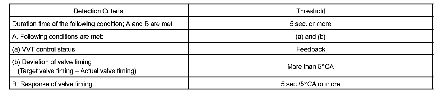 A DTC will set if: 1) the difference between the target and actual valve timing is more than 5 degrees of the crankshaft angle (CA) and the condition continues for more than 5 sec.; or 2) the OCV is forcibly activated 63 times or more.