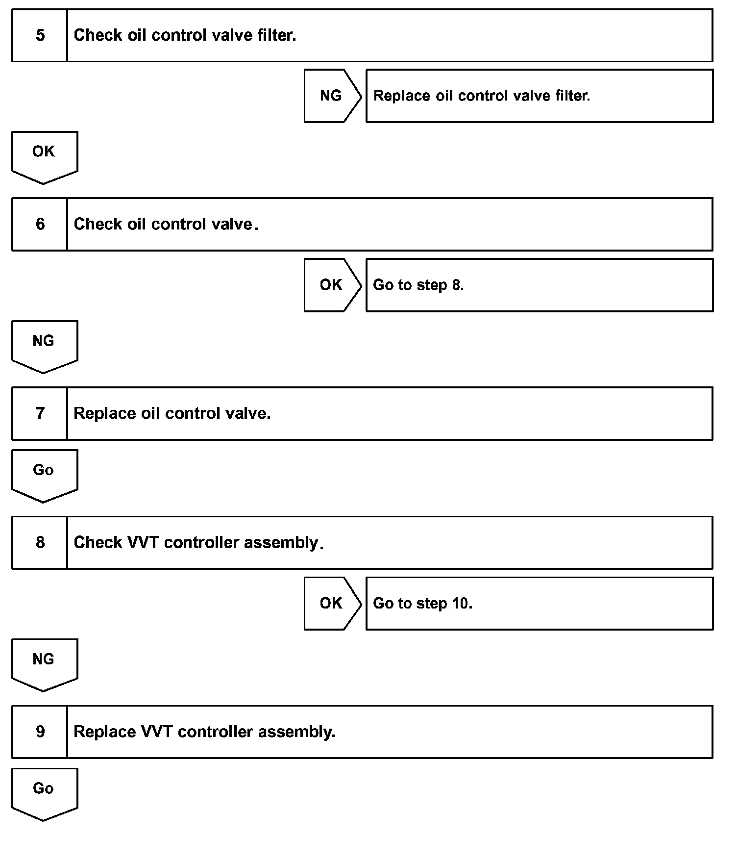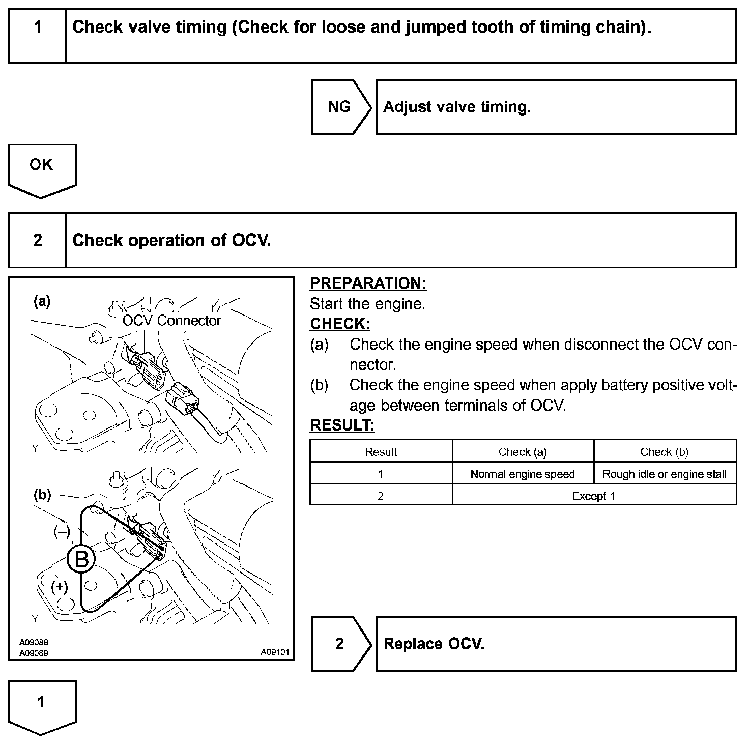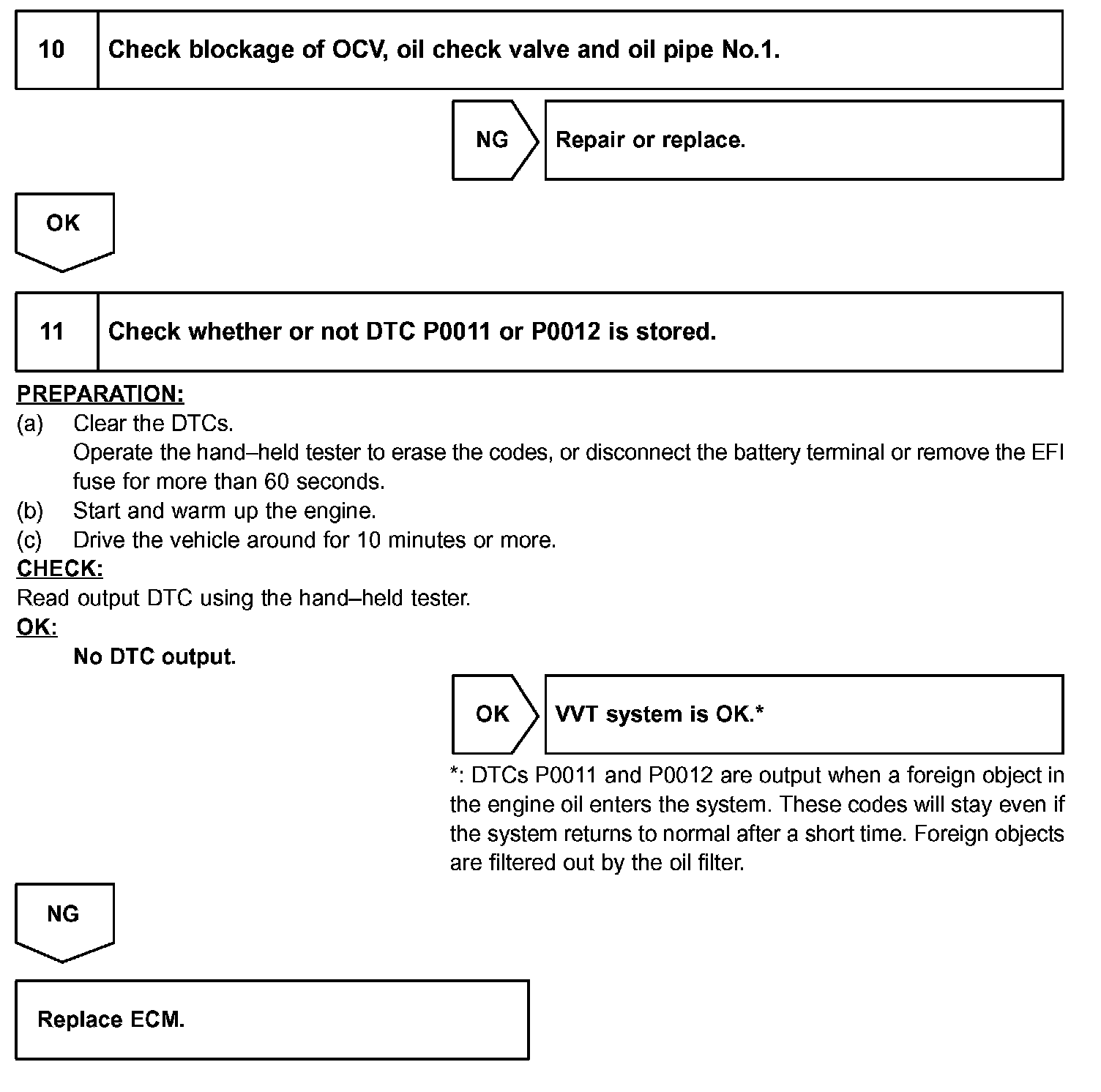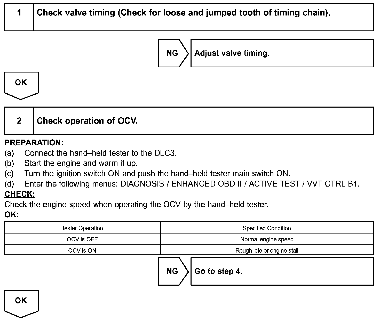 A DTC will set if: 1) the difference between the target and actual valve timing is more than 5 degrees of the crankshaft angle (CA) and the condition continues for more than 5 sec.; or 2) the OCV is forcibly activated 63 times or more.