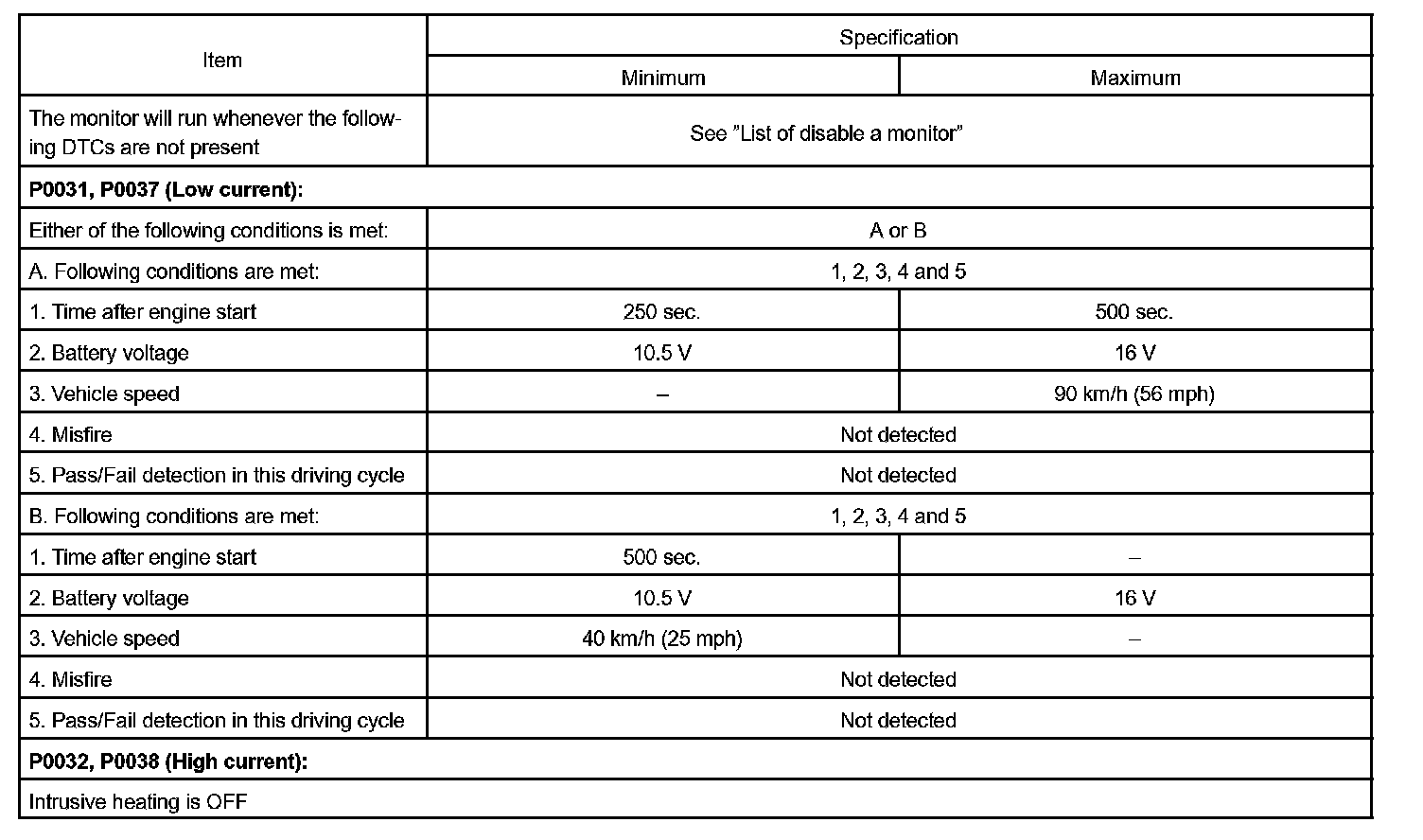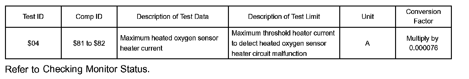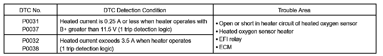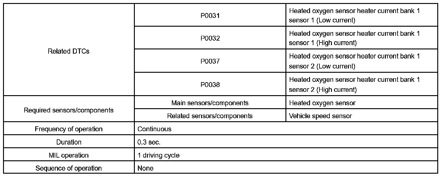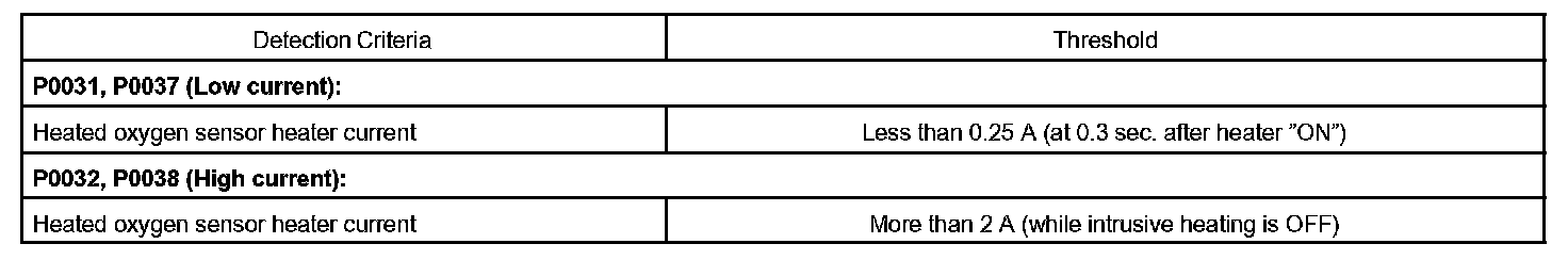 The ECM will set a high current DTC if the current in the sensor is more than 2 A when the heater is OFF. Similarly, the ECM will set a low current DTC if the current is less than 0.25 A when the heater is ON.