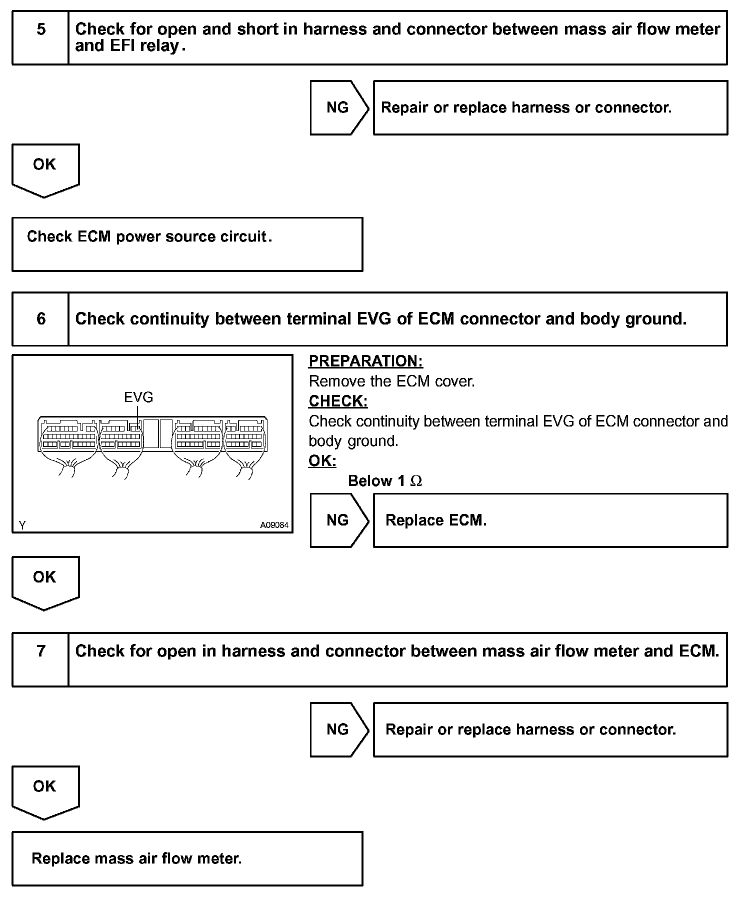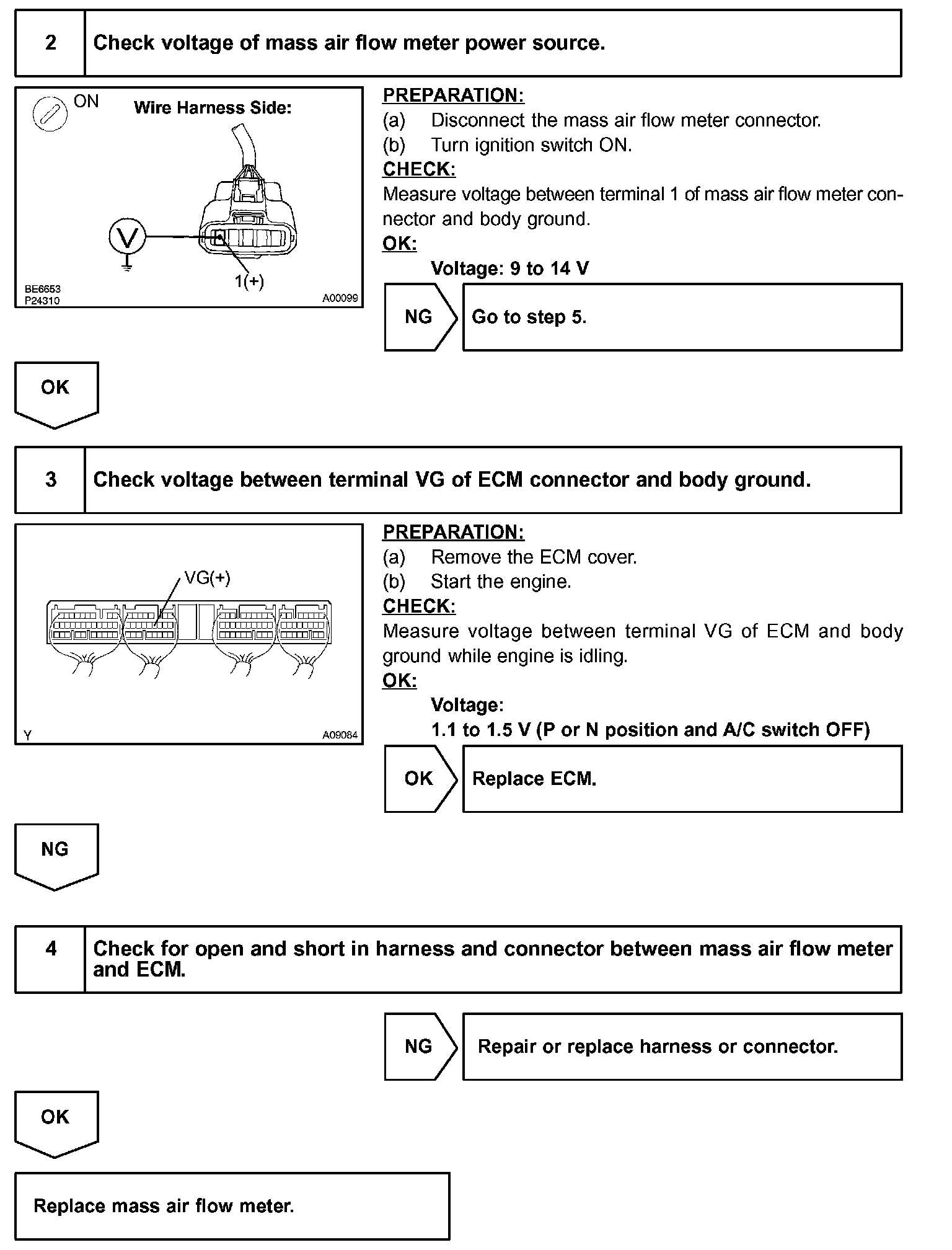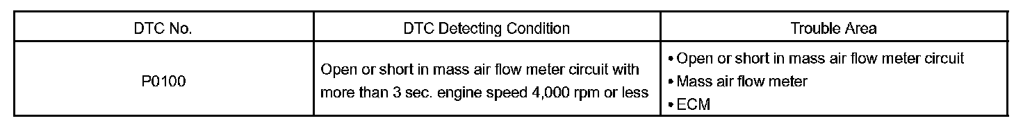 If there is a defect in the MAF (Mass Air Flow) meter or an open or short circuit, the voltage level will deviate outside the normal operating range. The ECM interprets this deviation as a defect in the MAF meter and sets a DTC.