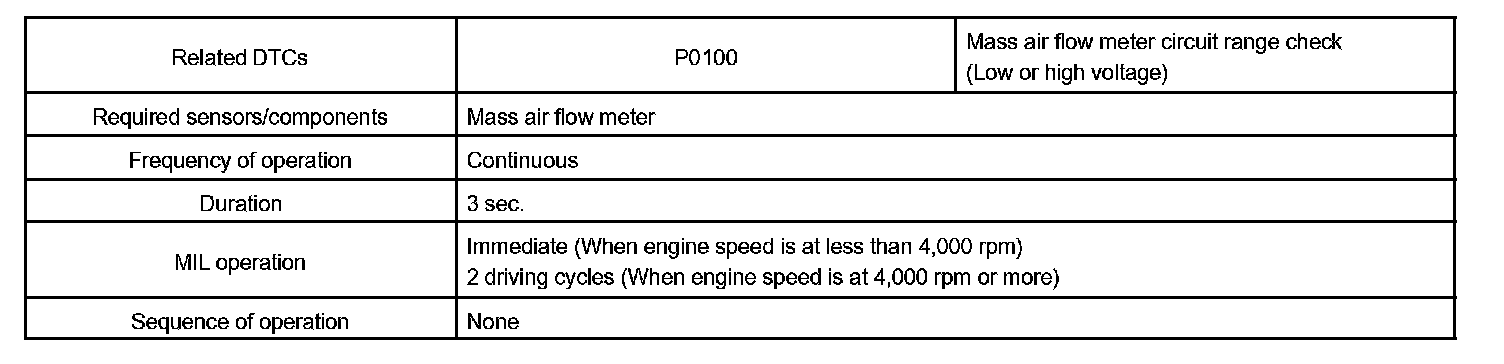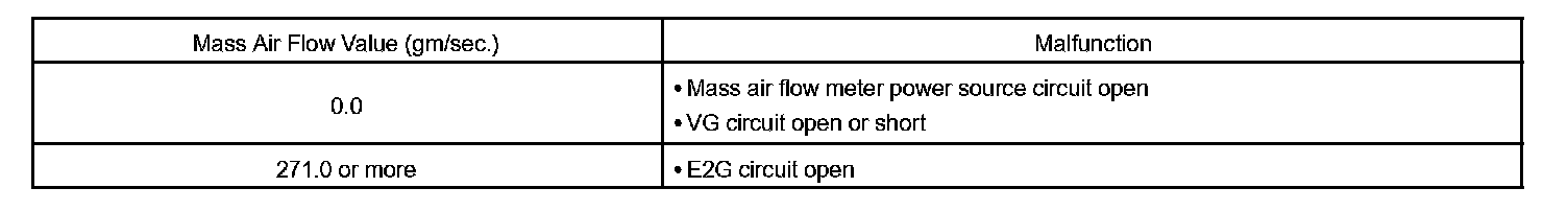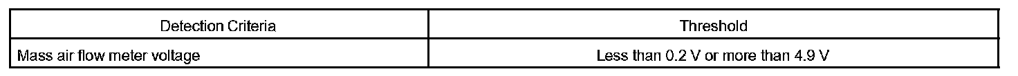 When the MAF meter voltage output is less than 0.2 V, or more than 4.9 V, and if either the condition continues for more than 3 sec.