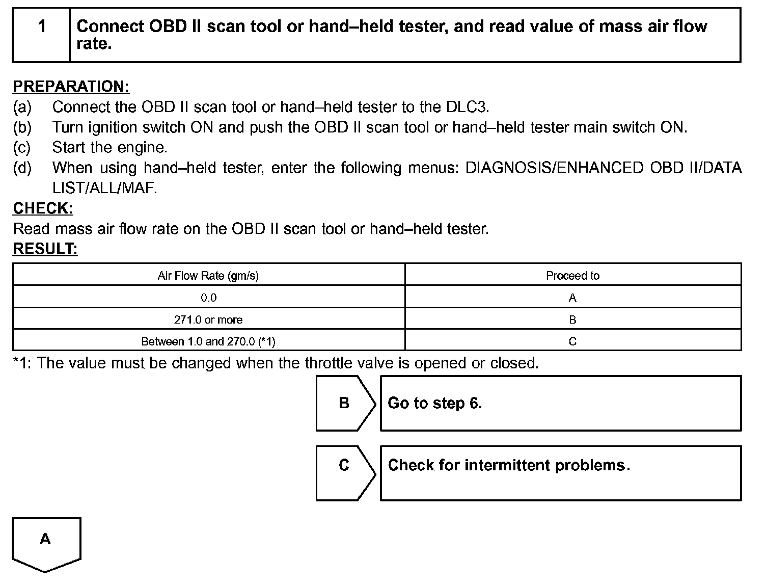 HINT: After confirming DTC P0100, confirm the mass air flow ratio in the "DIAGNOSIS / ENHANCED OBD II / DATA LIST / ALL" using the hand-held tester or the OBD II scan tool.
