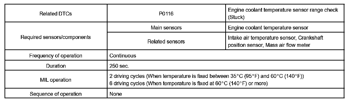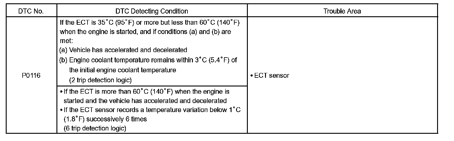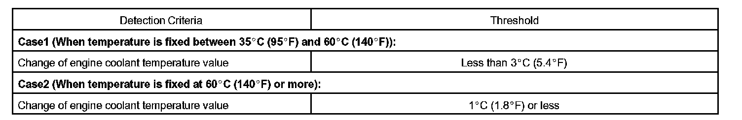 1. Upon starting the engine, the ECT is between 35 °C (95 °F) and 60 °C (140 °F). If after driving for 250 sec., the ECT still remains within 3 °C (5.4 °F) of the starting temperature, a DTC will be set (2 trip detection logic).