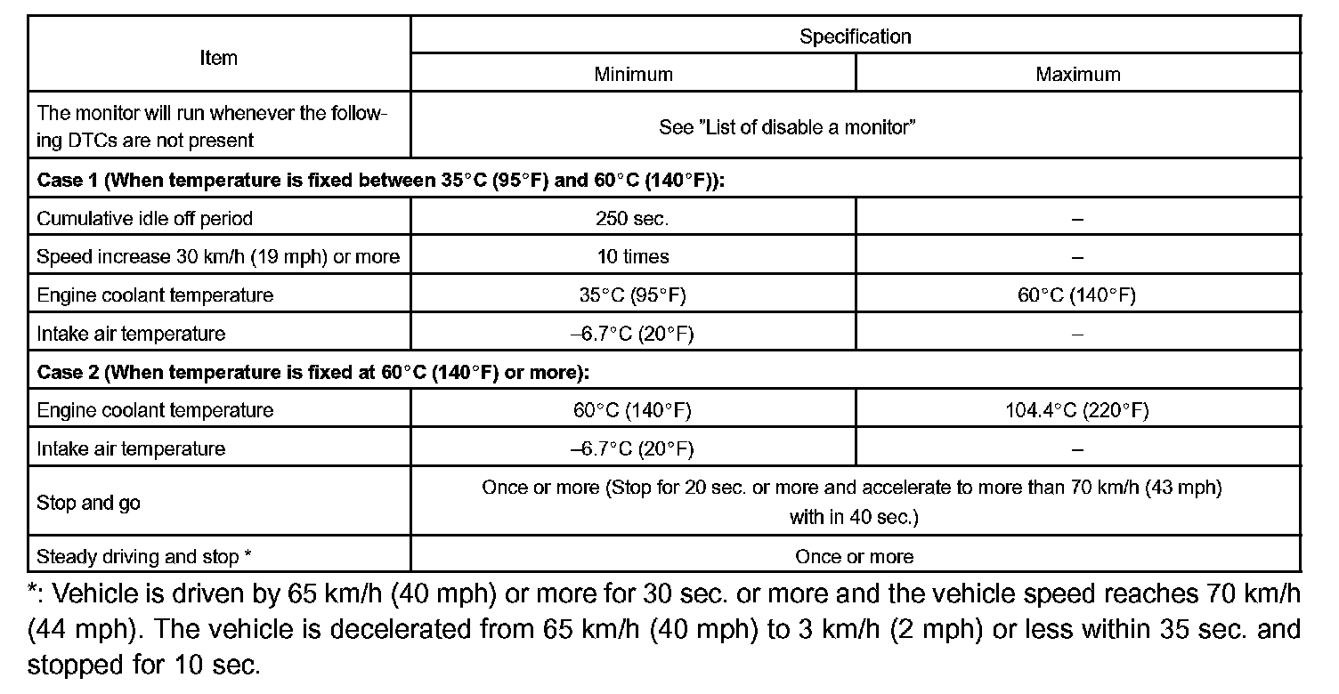 2. Upon starting the engine, the ECT is over 60 °C (140 °F). If after driving for 250 sec., the ECT still remains within 1 °C (1.8 °F) of the starting temperature, a DTC will be set (6 trip detection logic).