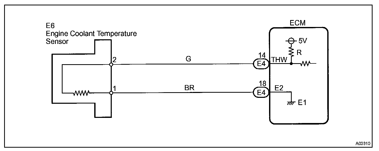 A thermistor is built in the Engine Coolant Temperature (ECT) sensor and changes the resistance value according to the engine coolant temperature.