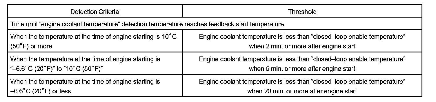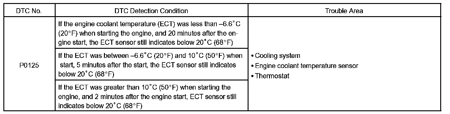 Example: The engine coolant temperature is 0 °C (32 °F) at engine start. After 5 min. running time, the ECT sensor still indicates that the engine is not warmed up enough to begin air fuel ratio feedback control of the air-fuel ratio. The ECM interprets this as a fault in the sensor or cooling system and will set a DTC.