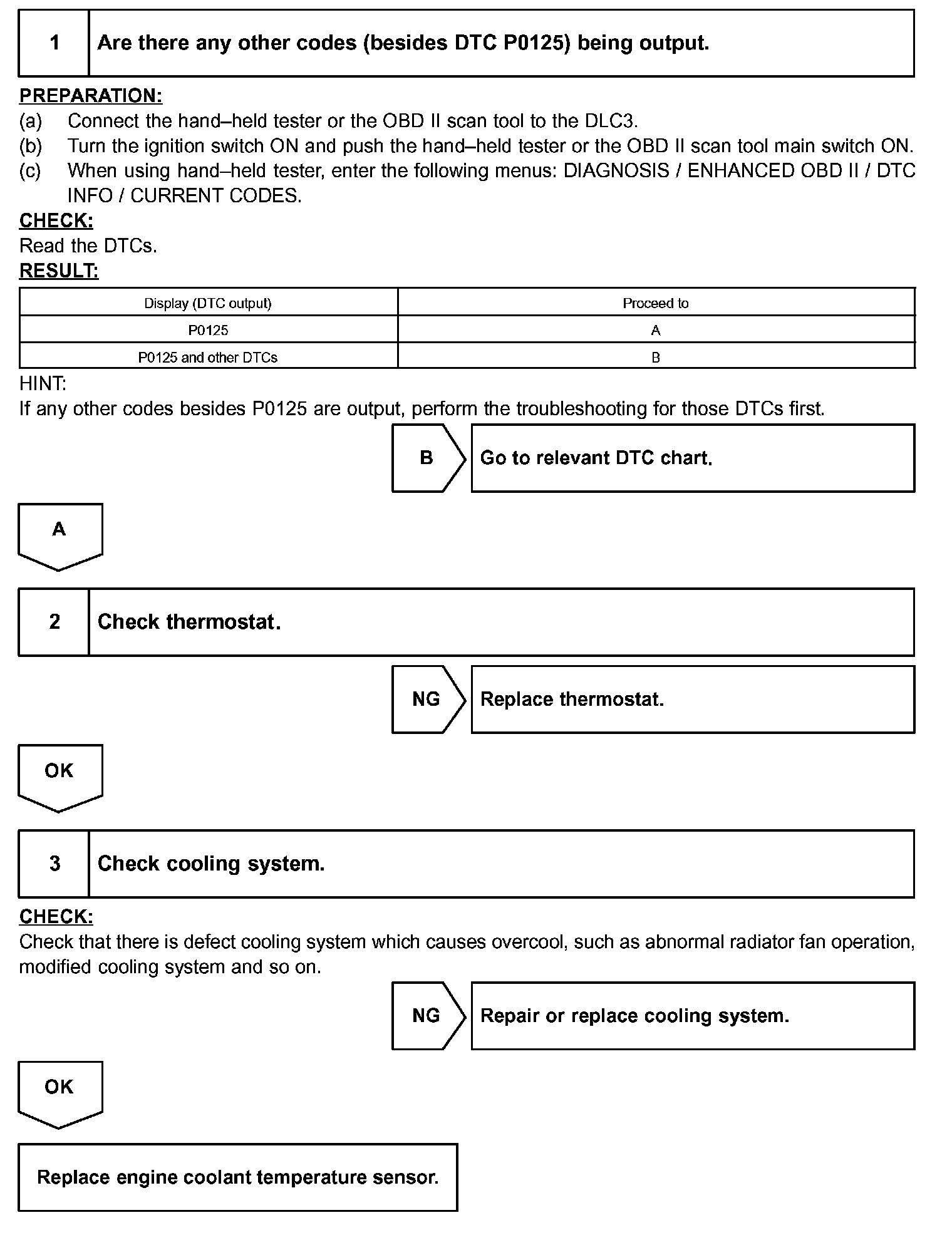 - If DTCs P0115, P0116 and P0125 are output simultaneously, the engine coolant temperature sensor circuit may be open or short. Perform the troubleshooting of DTC P0115 first.