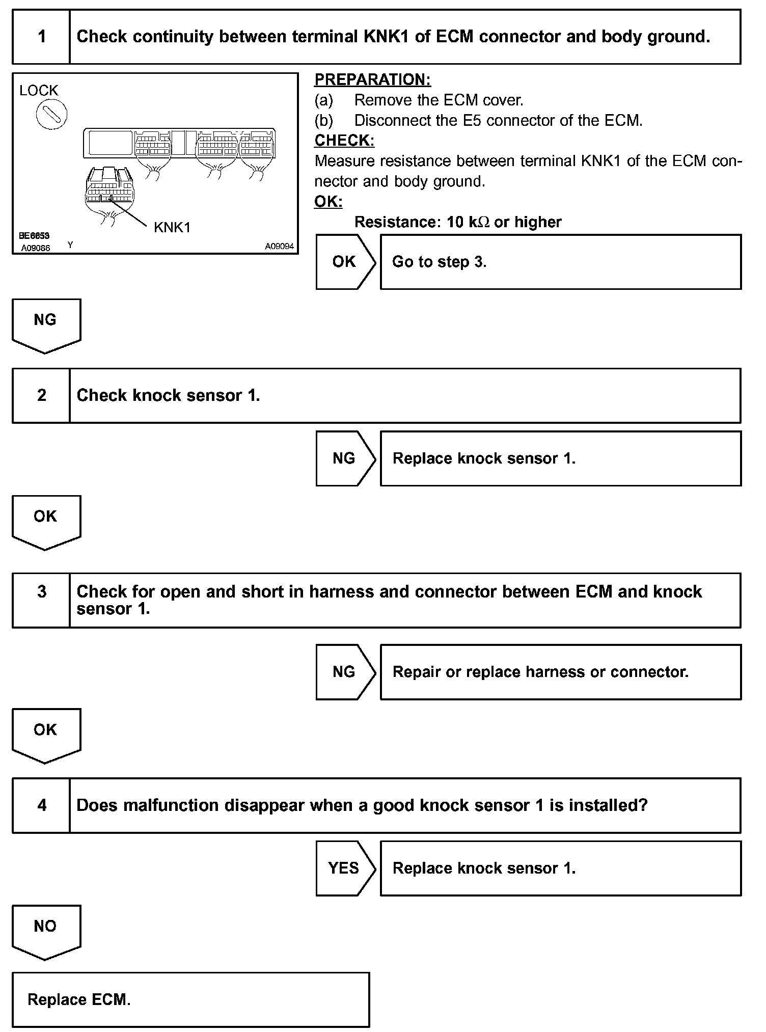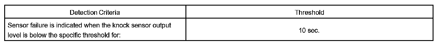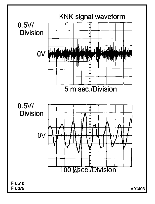 The ECM also senses background engine noise with the knock sensor and uses this noise to check for faults in the sensor. If the knock sensor signal level is too low for more than 10 sec., and if the knock sensor output voltage is out of normal range,the ECM interprets this as a fault in the knock sensor and sets a DTC.