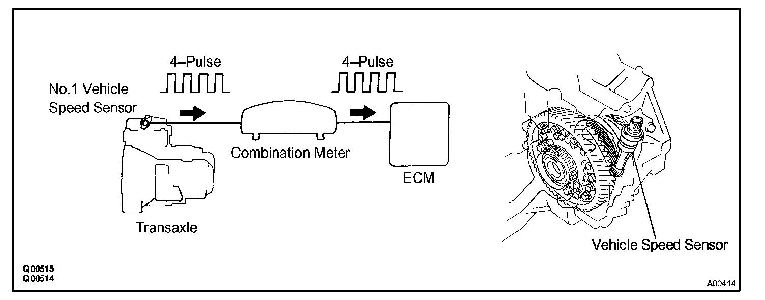 The No.1 vehicle speed sensor outputs a 4-pulse signal for every revolution of the rotor shaft, which is rotated by the transmission output shaft via the driven gear. After this signal is converted into a more precise rectangular waveform by the waveform shaping circuit inside the combination meter, it is then transmitted to the ECM. The ECM determines the vehicle speed based on the frequency of these pulse signals.