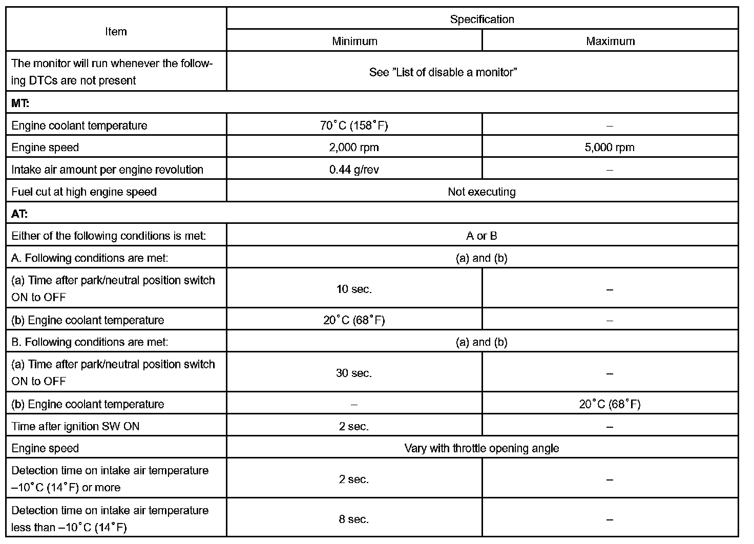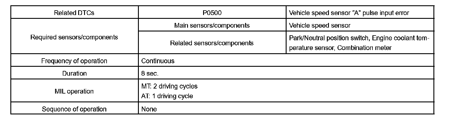 The ECM assumes that the vehicle is driven when the over 30 sec. have passed since the park/neutral position switch was turned OFF. If there is no signal from the vehicle speed sensor with these conditions satisfied, the ECM concludes that the vehicle speed sensor is malfunctioning. The ECM will turn on the MIL and a DTC is set.