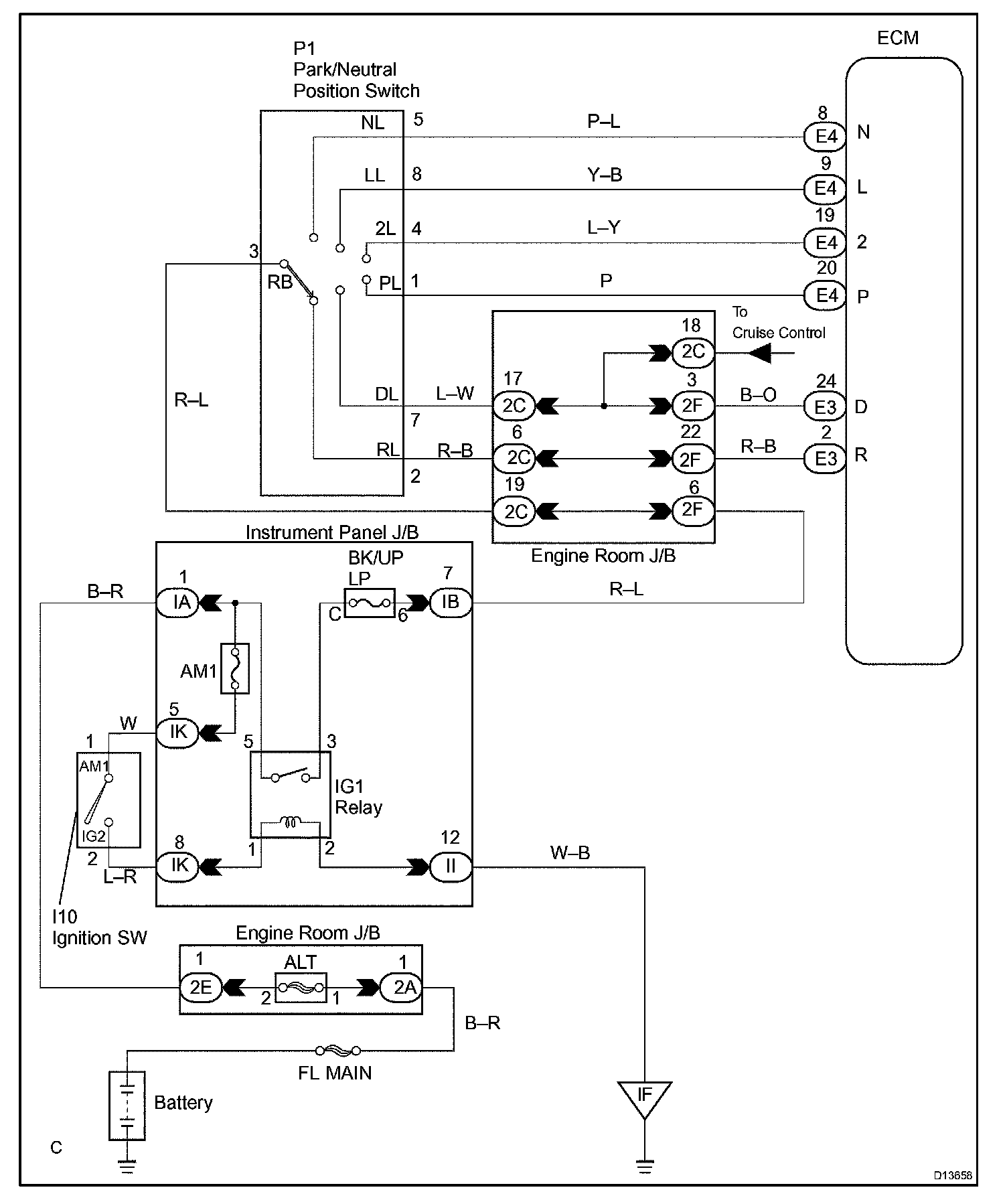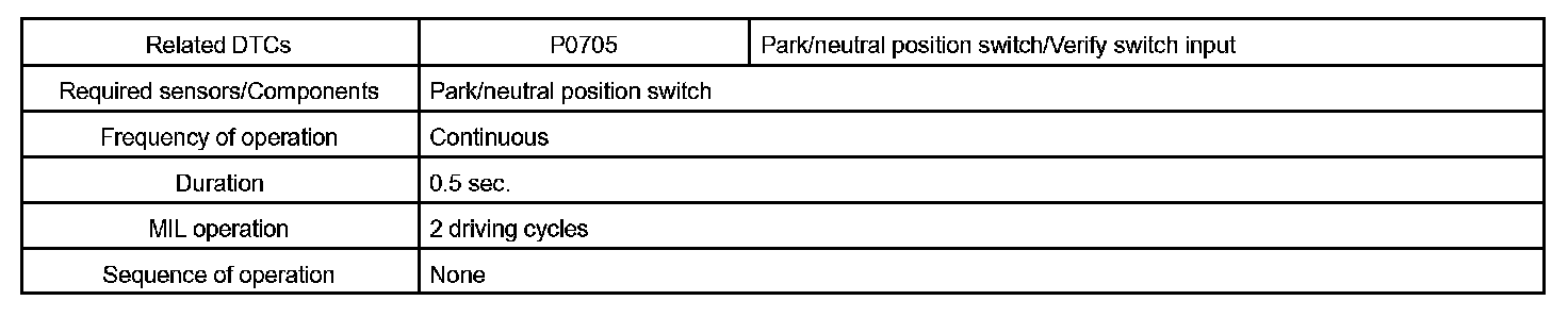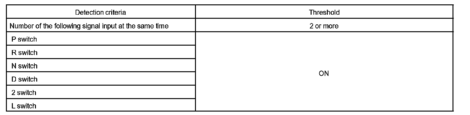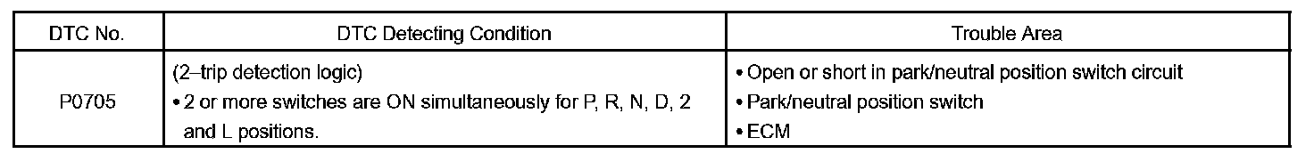 When the park/neutral position switch sends more than one signal at a time from switch positions P, R, N or D, the ECM interprets this as a fault in the switch. The ECM will turn on the MIL and store the DTC.