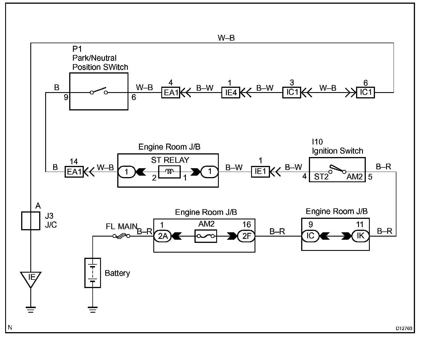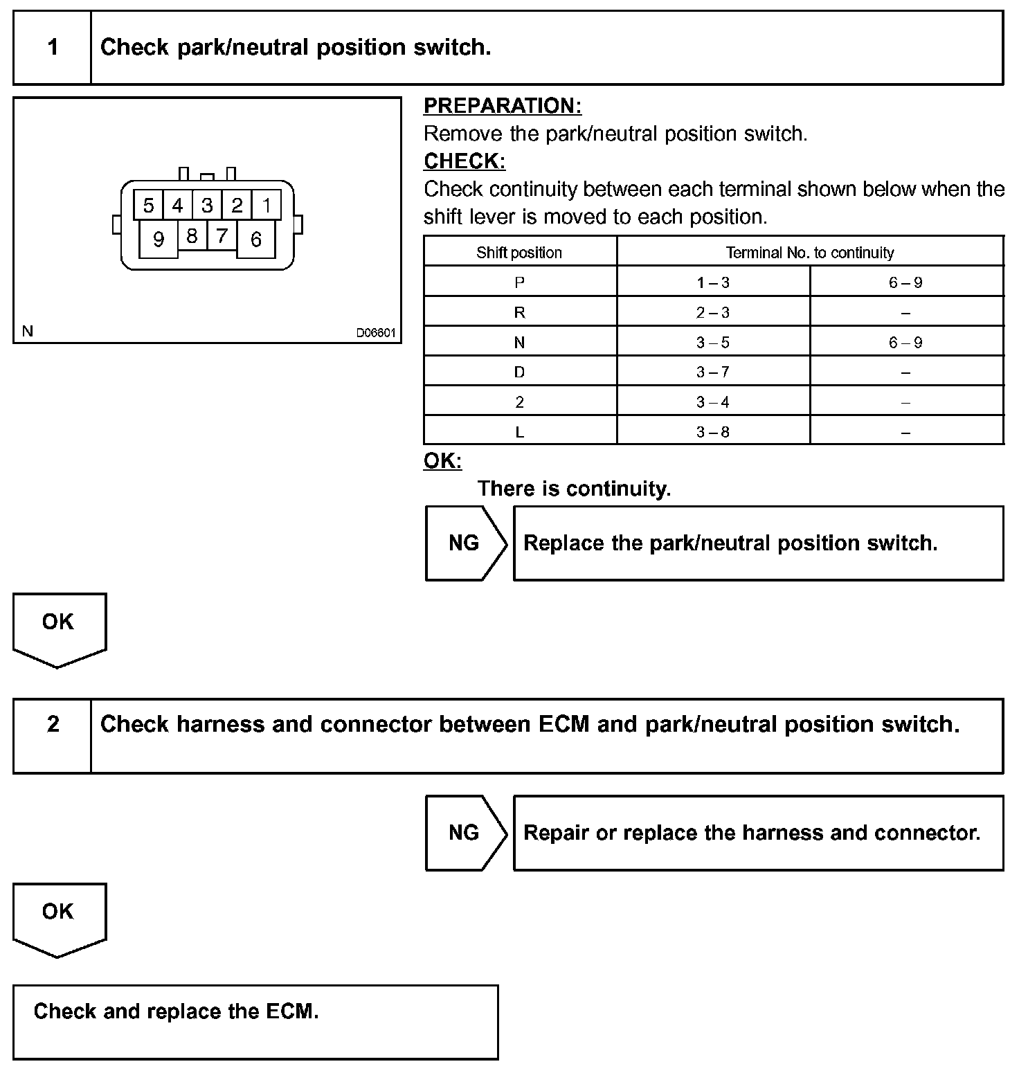 The neutral start switch detects the shift lever position and sends signals to the ECM. The ECM receives signals (P, R, N, D, 2 and L) from the park/neutral position switch.