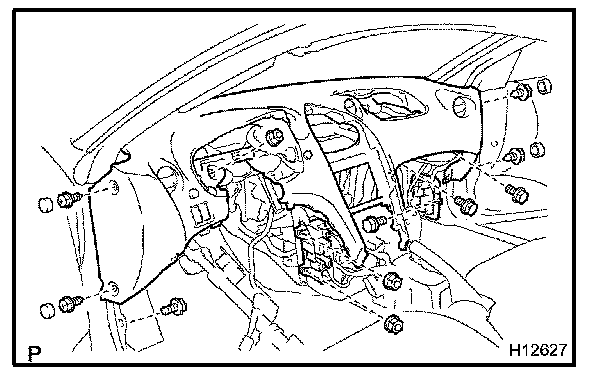 e. Remove the 2 bolts, nut, 4 screws and instrument panel.