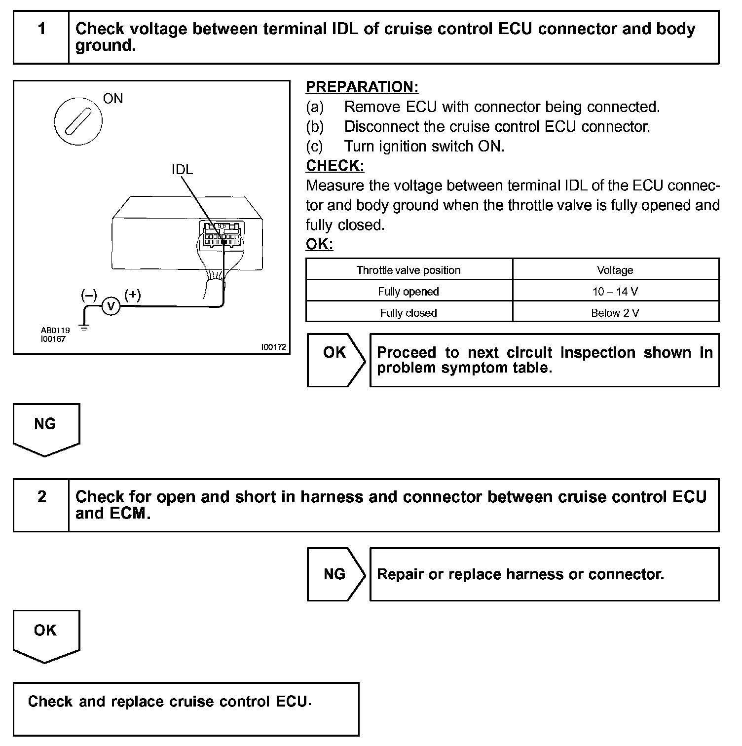 CIRCUIT DESCRIPTIONWhen the idle switch is turned ON, a signal is sent to the ECU. The ECU uses this signal to correct the discrepancy between the throttle valve position and the actuator position sensor value to enable accurate cruise control at the set speed. Since there will also be a problem when the idle switch malfunctions, inspect both the switch and the engine if the idle switch is faulty.