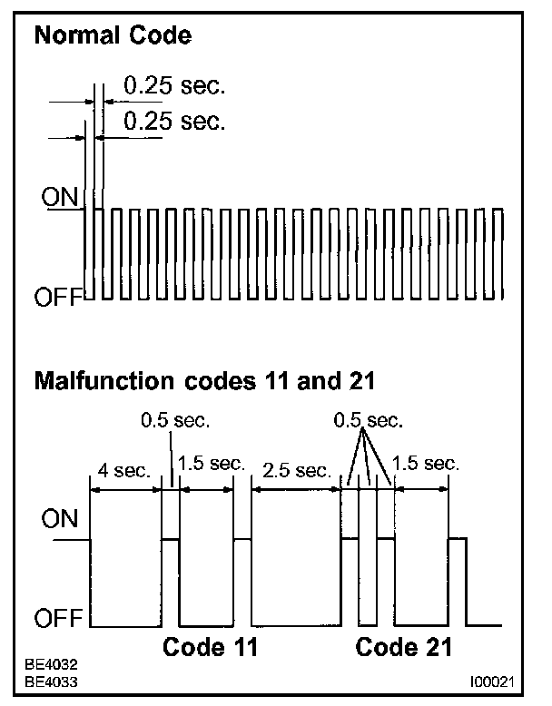- As an example, the blinking patterns of normal code, code 11 and code 21 are shown in the illustration.