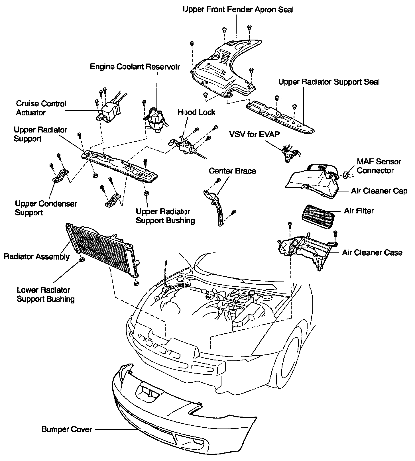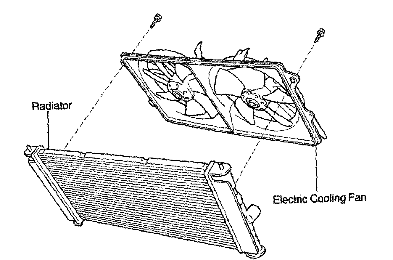 ^ The points shown in the illustration and oil cooler near here (A/T) cannot be staked with SST. Use wrap vinyl tape around the tip of a pair or similar object and be careful not to damage the core plates.