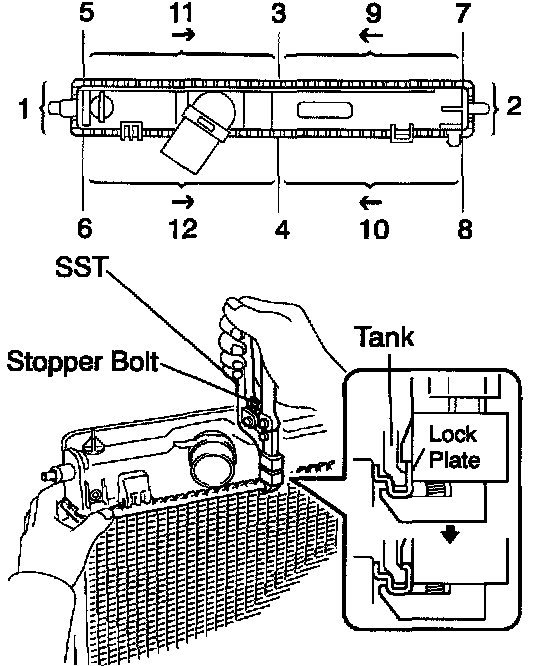 a. Lightly press SST against the lock plate in the order shown in the illustration. After repeating this a few times, fully caulk the lock plate by squeezing the handle until stopped by the stopped plate.