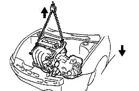 b. Slowly lower the vehicle, and raise the engine into the engine compartment.