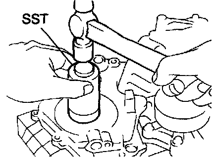 3. Using SST and a hammer, tap in the oil seal until its surface is flush with the timing chain cover edge.