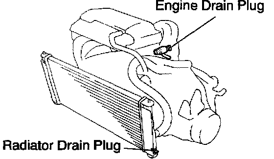 b. Loosen the radiator drain plug (in the left under side of the radiator tank) and engine drain plug on the engine coolant drain union (on the left rear of the cylinder block), and drain the coolant.