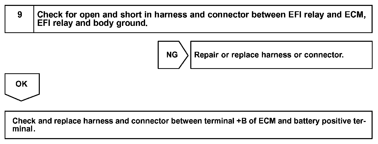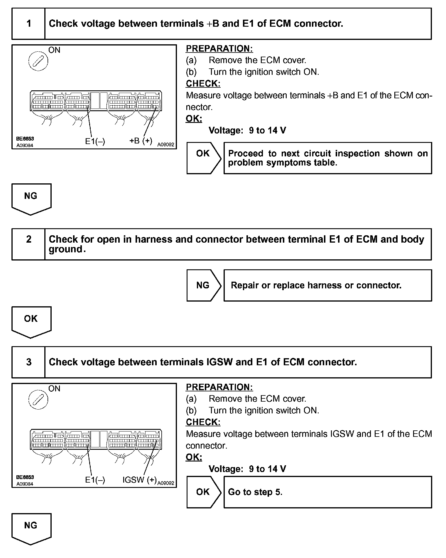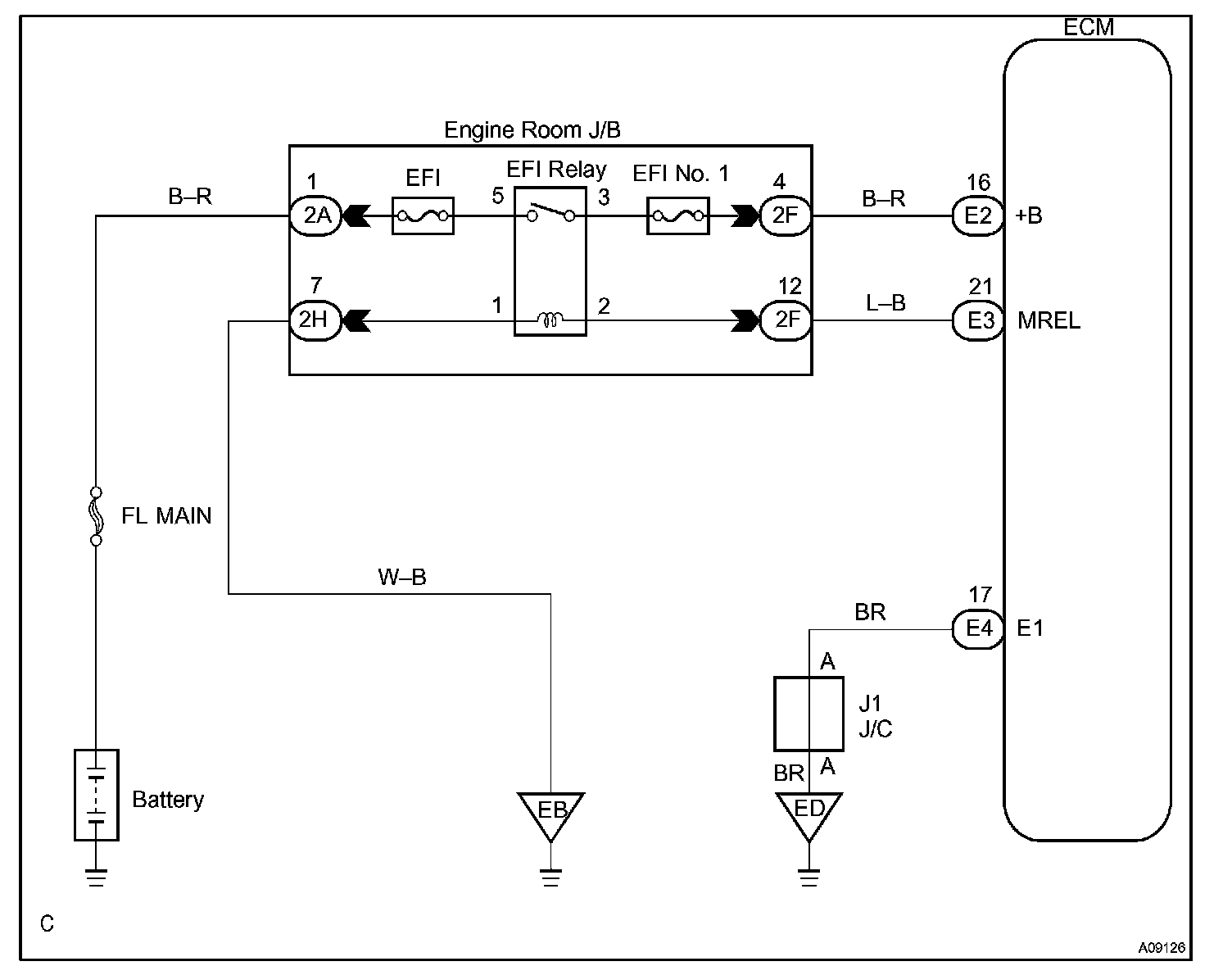 CIRCUIT DESCRIPTIONWhen the ignition switch is turned ON, battery voltage is applied to terminal IGSW of the ECM. The ECM "MREL" output signal causes current to flow to the coil, closing the contacts of the EFI relay and supplying power to terminal +B of the ECM.