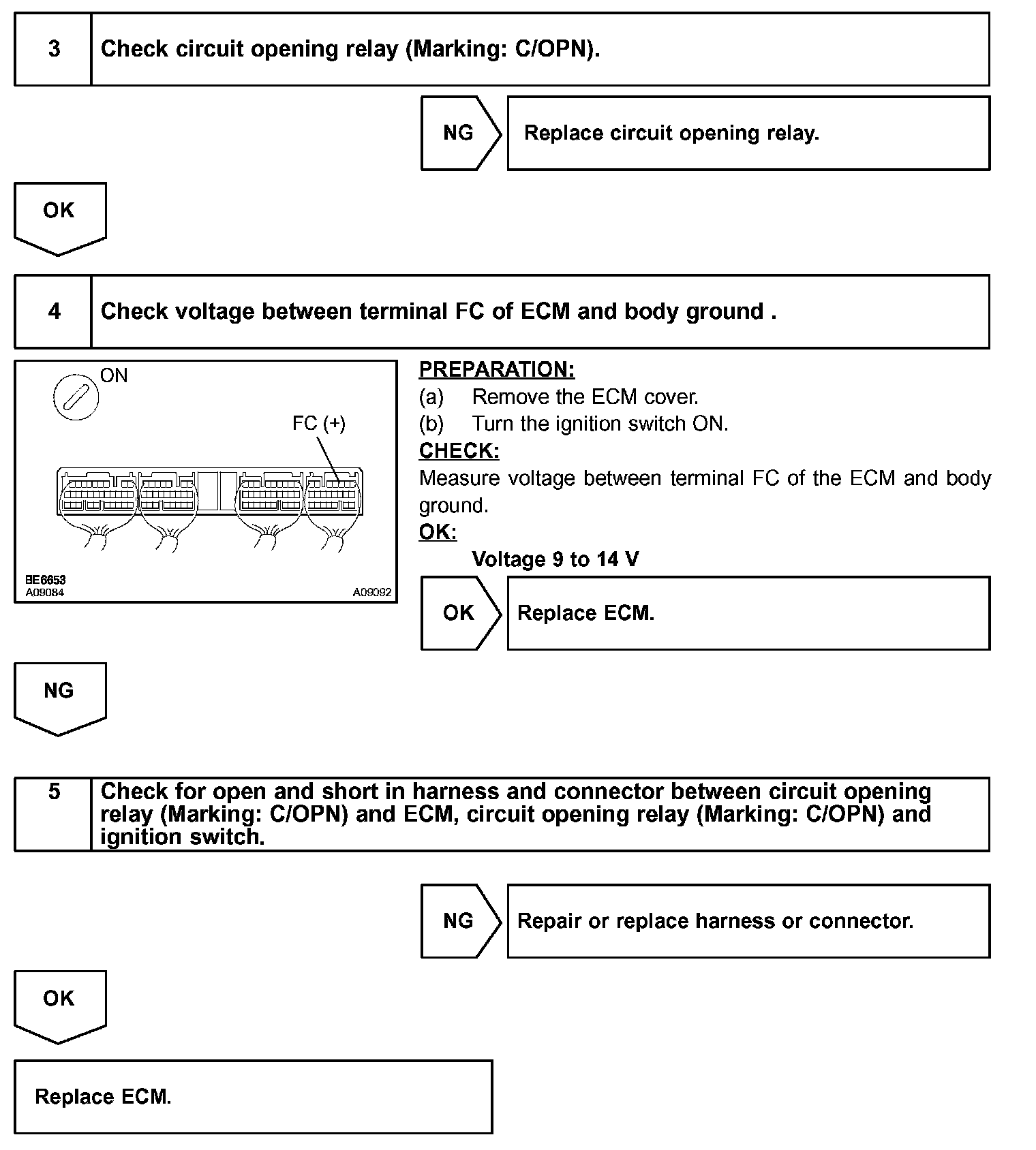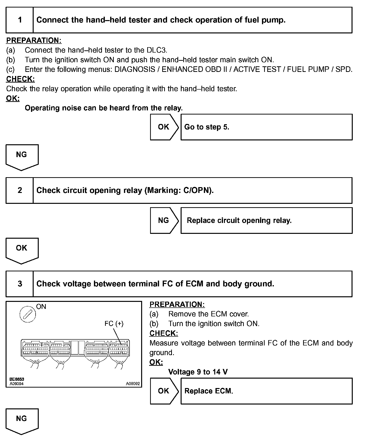 When the STA signal and NE signal are input to the ECM, Tr is turned ON, current flows to the coil of the circuit opening relay, the relay switches on, power is supplied to the fuel pump and the fuel pump operates. While the NE signal is generated (engine running), the ECM keeps Tr ON (circuit opening relay ON) and the fuel pump also keeps operating.