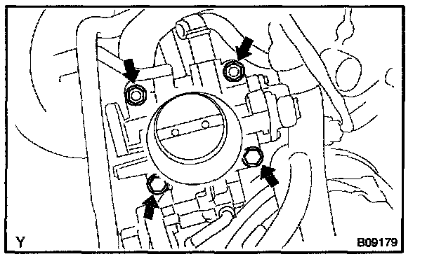 f. Remove the 2 bolts, 2 nuts and throttle body from the intake manifold.