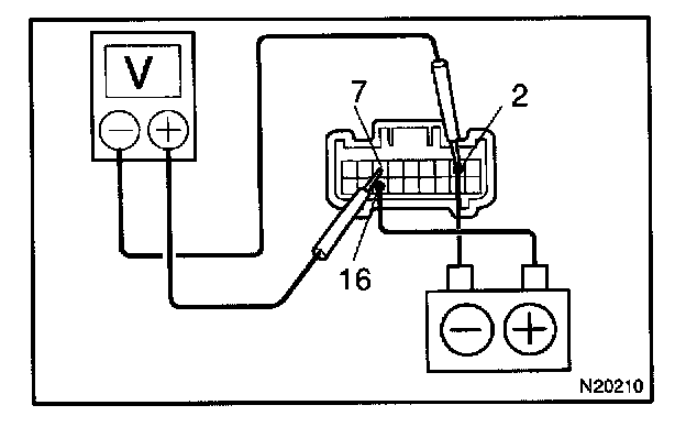 d. Connect the positive (+) lead from the voltmeter to terminal 7 and the negative (-) lead to terminal 2, check that the meter needle indicates battery voltage.
